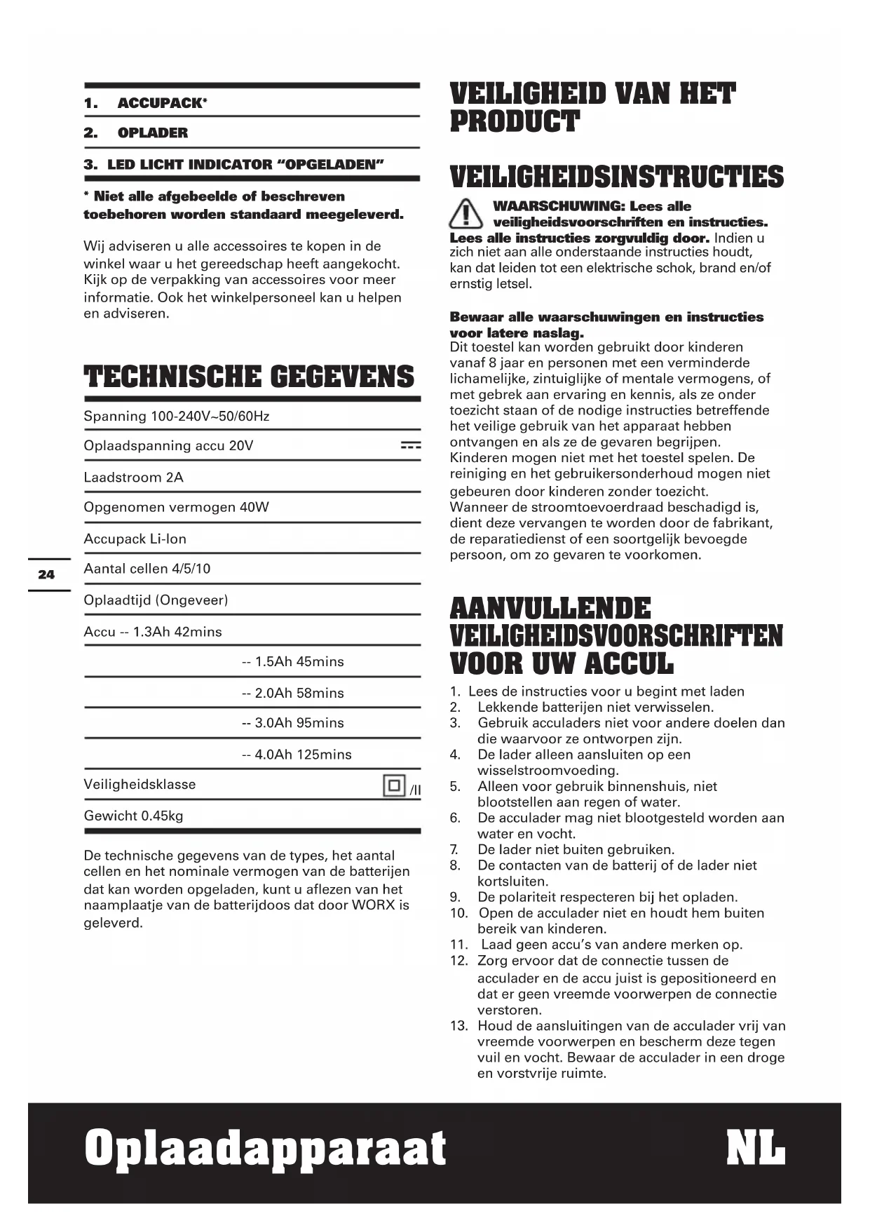 - Niet alle afgebeelde of beschreven toebehoren worden standaard meegeleverd. Wij adviseren u alle accessoires te kopen in de winkel waar u het gereedschap heeft aangekocht. Kijk op de verpakking van accessoires voor meer informatie. Ook het winkelpersoneel kan u helpen en adviseren. TECHNISCHE GEGEVENS Spanning 100-240V~50/60Hz Oplaadspanning accu 20V Laadstroom 2A Opgenomen vermogen 40W Accupack Li-Ion Aantal cellen 4/5/10 Oplaadtijd (Ongeveer) Accu -- 1.3Ah 42mins -- 1.5Ah 45mins -- 2.0Ah 58mins -- 3.0Ah 95mins -- 4.0Ah 125mins Veiligheidsklasse /II Gewicht 0.45kg De technische gegevens van de types, het aantal cellen en het nominale vermogen van de batterijen dat kan worden opgeladen, kunt u aflezen van het naamplaatje van de batterijdoos dat door WORX is geleverd.