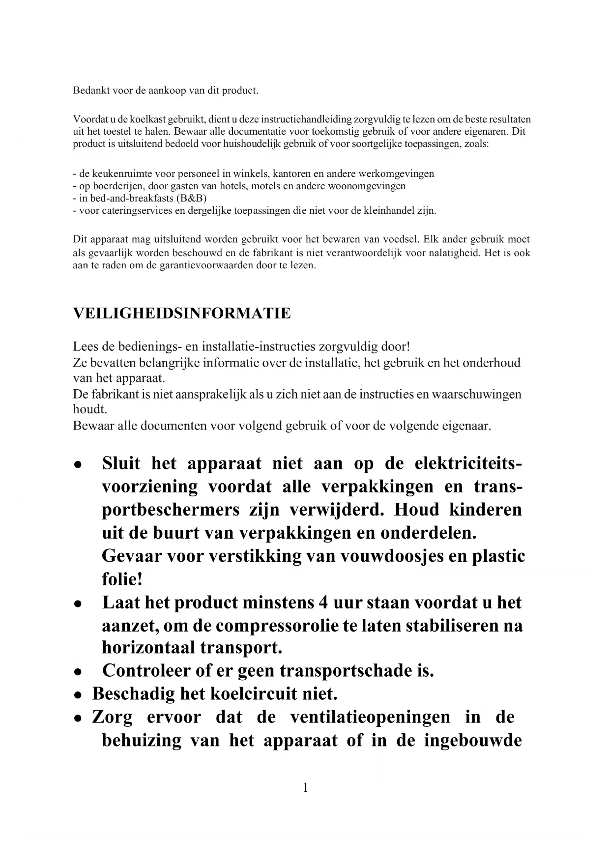 Bedankt voor de aankoop van dit product. Voordat u de koelkast gebruikt, dient u deze instructiehandleiding zorgvuldig te lezen om de beste resultaten uit het toestel te halen. Bewaar alle documentatie voor toekomstig gebruik of voor andere eigenaren. Dit product is uitsluitend bedoeld voor huishoudelijk gebruik of voor soortgelijke toepassingen, zoals: - de keukenruimte voor personeel in winkels, kantoren en andere werkomgevingen - op boerderijen, door gasten van hotels, motels en andere woonomgevingen - in bed-and-breakfasts (B&B) - voor cateringservices en dergelijke toepassingen die niet voor de kleinhandel zijn. Dit apparaat mag uitsluitend worden gebruikt voor het bewaren van voedsel. Elk ander gebruik moet als gevaarlijk worden beschouwd en de fabrikant is niet verantwoordelijk voor nalatigheid. Het is ook aan te raden om de garantievoorwaarden door te lezen. VEILIGHEIDSINFORMATIE Lees de bedienings- en installatie-instructies zorgvuldig door! Ze bevatten belangrijke informatie over de installatie, het gebruik en het onderhoud van het apparaat. De fabrikant is niet aansprakelijk als u zich niet aan de instructies en waarschuwingen houdt. Bewaar alle documenten voor volgend gebruik of voor de volgende eigenaar. ● Sluit het apparaat niet aan op de elektriciteits- voorziening voordat alle verpakkingen en trans- portbeschermers zijn verwijderd. Houd kinderen uit de buurt van verpakkingen en onderdelen. Gevaar voor verstikking van vouwdoosjes en plastic folie! ● Laat het product minstens 4 uur staan voordat u het aanzet, om de compressorolie te laten stabiliseren na horizontaal transport. ● Controleer of er geen transportschade is. ● Beschadig het koelcircuit niet. ● Zorg ervoor dat de ventilatieopeningen in de behuizing van het apparaat of in de ingebouwde