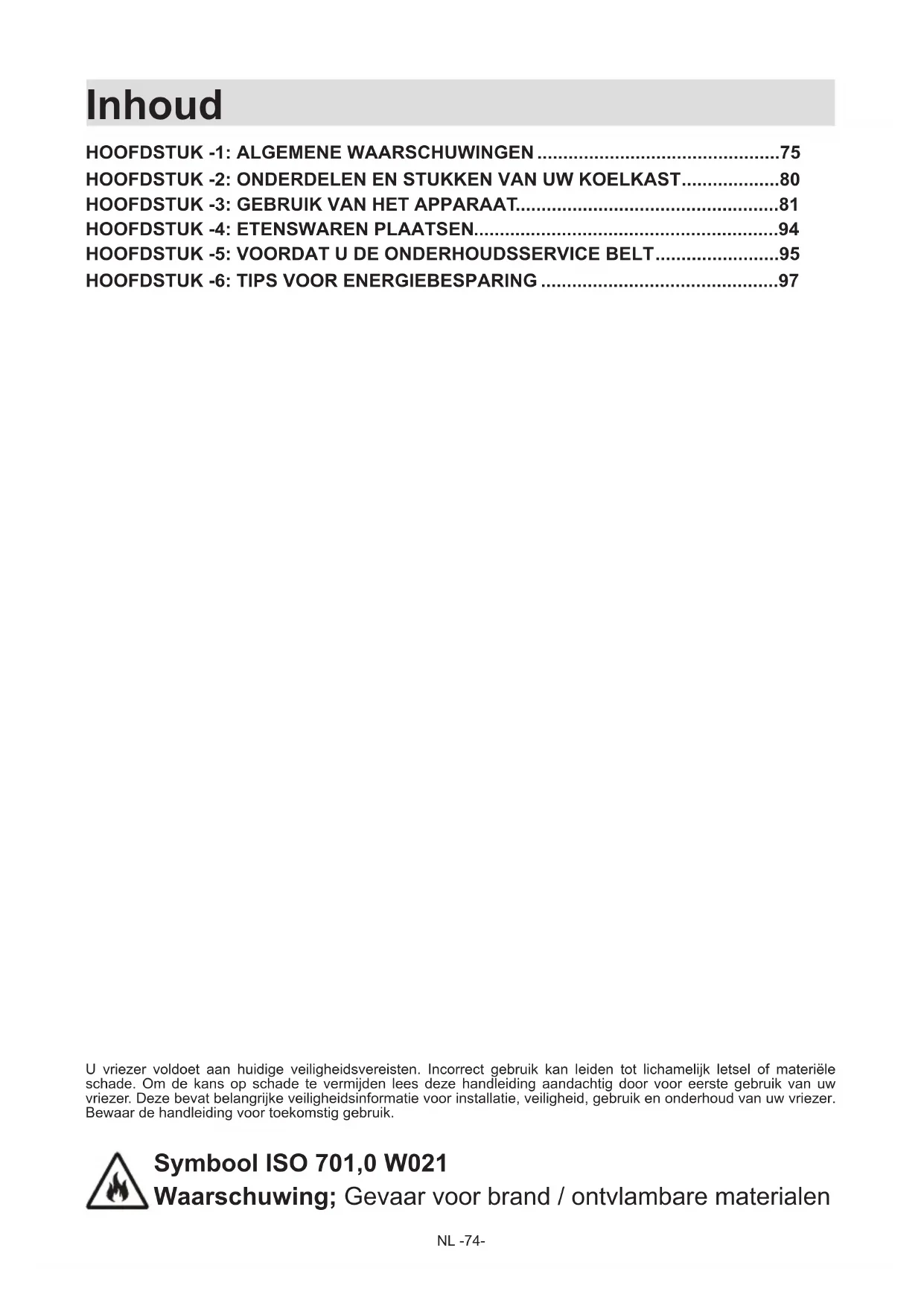 U vriezer voldoet aan huidige veiligheidsvereisten. Incorrect gebruik kan leiden tot lichamelijk letsel of materiële schade. Om de kans op schade te vermijden lees deze handleiding aandachtig door voor eerste gebruik van uw vriezer. Deze bevat belangrijke veiligheidsinformatie voor installatie, veiligheid, gebruik en onderhoud van uw vriezer. Bewaar de handleiding voor toekomstig gebruik. Symbool ISO 701,0 W021 Waarschuwing; Gevaar voor brand / ontvlambare materialenNL -75-