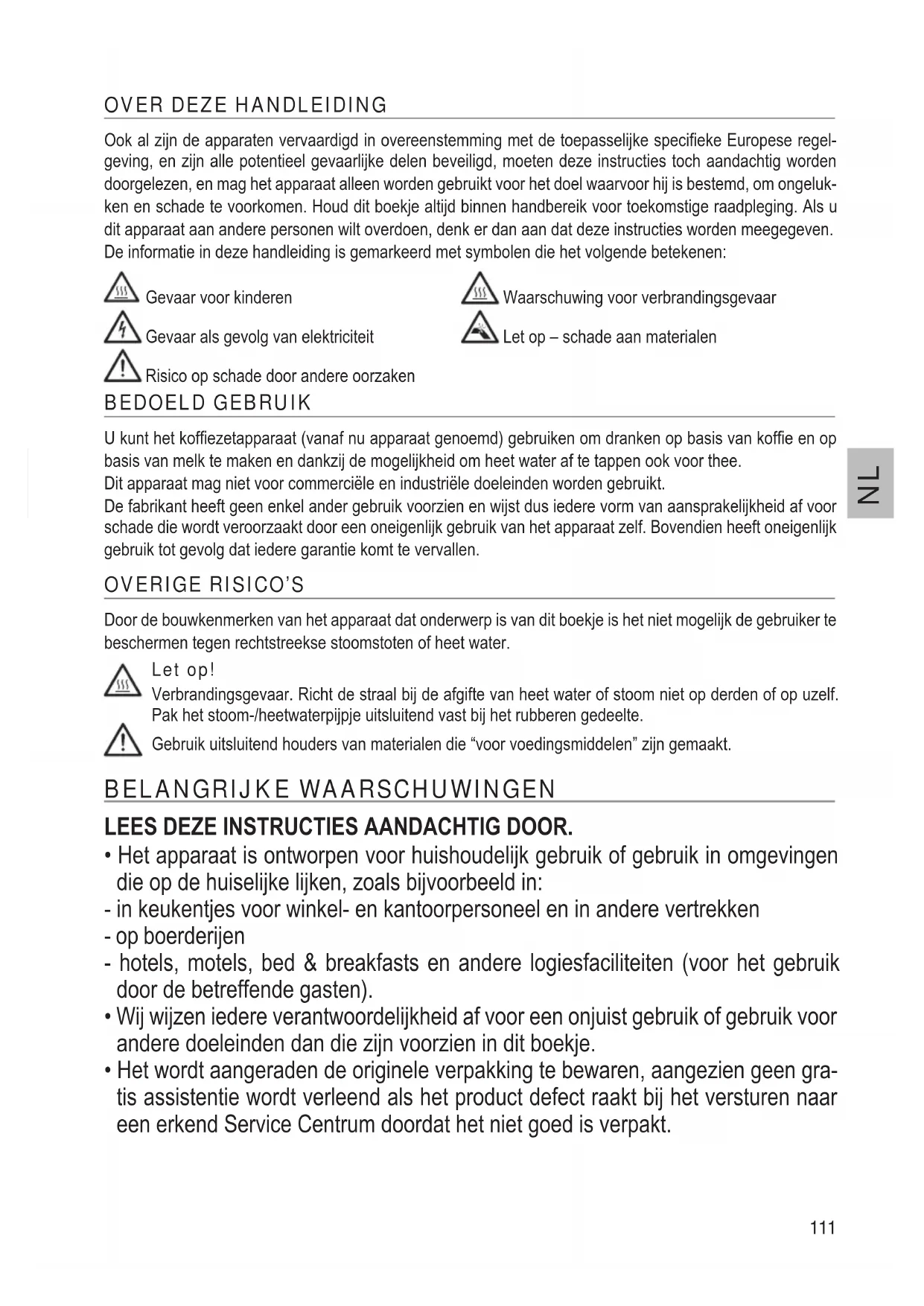 Door de bouwkenmerken van het apparaat dat onderwerp is van dit boekje is het niet mogelijk de gebruiker te beschermen tegen rechtstreekse stoomstoten of heet water. Let op! Verbrandingsgevaar. Richt de straal bij de afgifte van heet water of stoom niet op derden of op uzelf. Pak het stoom-/heetwaterpijpje uitsluitend vast bij het rubberen gedeelte. Gebruik uitsluitend houders van materialen die “voor voedingsmiddelen” zijn gemaakt. BELANGRIJKE WAARSCHUWINGEN LEES DEZE INSTRUCTIES AANDACHTIG DOOR. Het apparaat is ontworpen voor huishoudelijk gebruik of gebruik in omgevingen die op de huiselijke lijken, zoals bijvoorbeeld in: - in keukentjes voor winkel- en kantoorpersoneel en in andere vertrekken - op boerderijen - hotels, motels, bed & breakfasts en andere logiesfaciliteiten (voor het gebruik door de betreffende gasten). Wij wijzen iedere verantwoordelijkheid af voor een onjuist gebruik of gebruik voor andere doeleinden dan die zijn voorzien in dit boekje. Het wordt aangeraden de originele verpakking te bewaren, aangezien geen gra- tis assistentie wordt verleend als het product defect raakt bij het versturen naar een erkend Service Centrum doordat het niet goed is verpakt.112