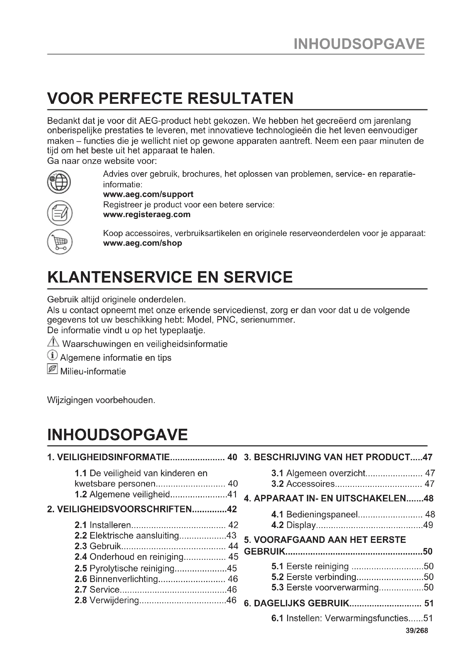 Bedankt dat je voor dit AEG-product hebt gekozen. We hebben het gecreëerd om jarenlang onberispelijke prestaties te leveren, met innovatieve technologieën die het leven eenvoudiger maken – functies die je wellicht niet op gewone apparaten aantreft. Neem een paar minuten de tijd om het beste uit het apparaat te halen. Ga naar onze website voor: Advies over gebruik, brochures, het oplossen van problemen, service- en reparatie- informatie: www.aeg.com/support Registreer je product voor een betere service: www.registeraeg.com Koop accessoires, verbruiksartikelen en originele reserveonderdelen voor je apparaat: www.aeg.com/shop
