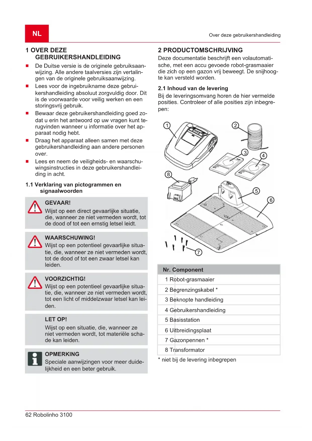 signaalwoorden GEVAAR! Wijst op een direct gevaarlijke situatie, die, wanneer ze niet vermeden wordt, tot de dood of tot een ernstig letsel leidt. WAARSCHUWING! Wijst op een potentieel gevaarlijke situa- tie, die, wanneer ze niet vermeden wordt, tot de dood of tot een zwaar letsel kan leiden. VOORZICHTIG! Wijst op een potentieel gevaarlijke situa- tie, die, wanneer ze niet vermeden wordt, tot een licht of middelzwaar letsel kan lei- den. LET OP! Wijst op een situatie, die, wanneer ze niet vermeden wordt, tot materiële scha- de kan leiden. OPMERKING Speciale aanwijzingen voor meer duide- lijkheid en een beter gebruik. 2 PRODUCTOMSCHRIJVING Deze documentatie beschrijft een volautomati- sche, met een accu gevoede robot-grasmaaier die zich op een gazon vrij beweegt. De snijhoog- te kan versteld worden.