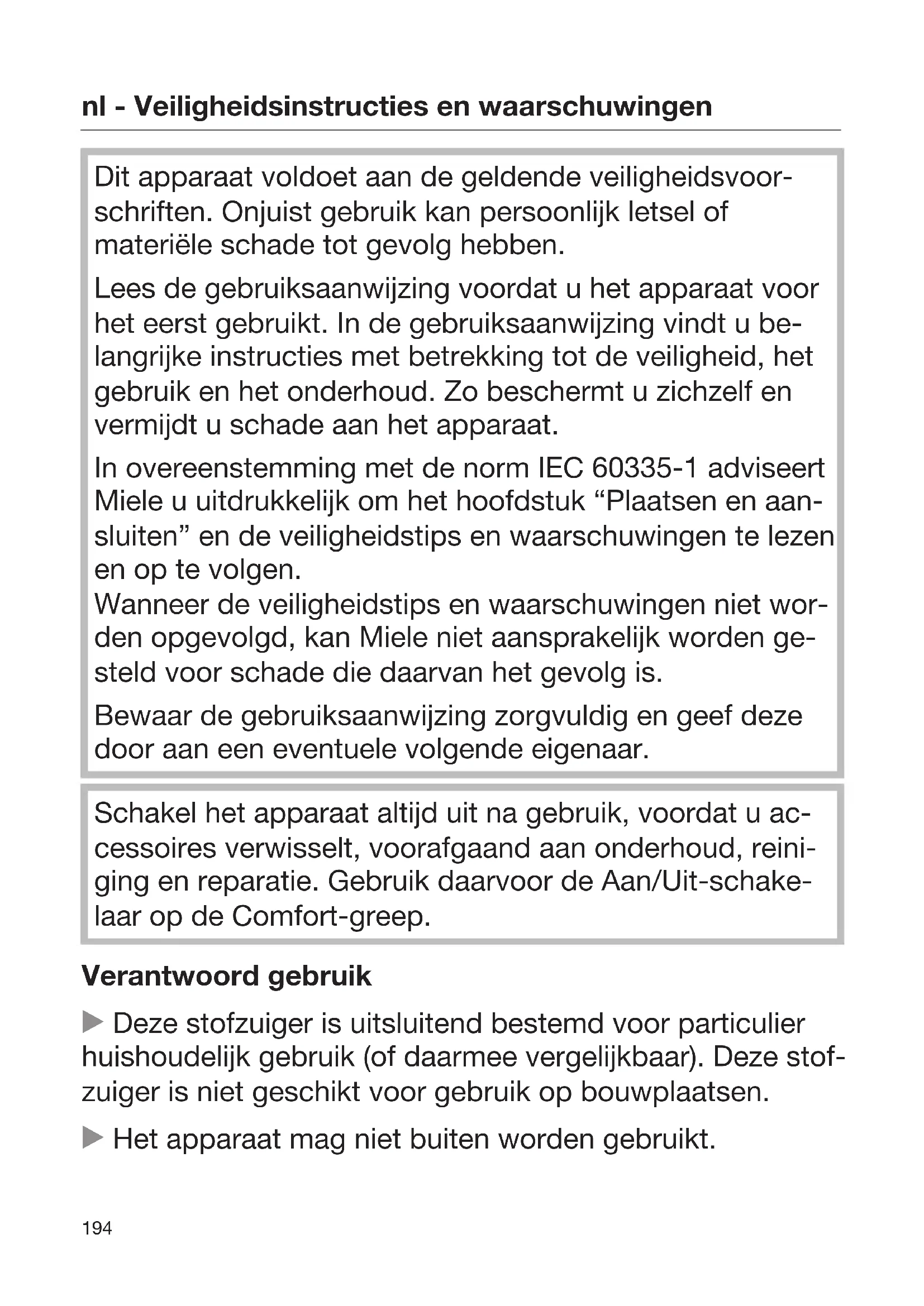 Dit apparaat voldoet aan de geldende veiligheidsvoor- schriften. Onjuist gebruik kan persoonlijk letsel of materiële schade tot gevolg hebben. Lees de gebruiksaanwijzing voordat u het apparaat voor het eerst gebruikt. In de gebruiksaanwijzing vindt u be- langrijke instructies met betrekking tot de veiligheid, het gebruik en het onderhoud. Zo beschermt u zichzelf en vermijdt u schade aan het apparaat. In overeenstemming met de norm IEC60335-1 adviseert Miele u uitdrukkelijk om het hoofdstuk “Plaatsen en aan- sluiten” en de veiligheidstips en waarschuwingen te lezen en op te volgen. Wanneer de veiligheidstips en waarschuwingen niet wor- den opgevolgd, kan Miele niet aansprakelijk worden ge- steld voor schade die daarvan het gevolg is. Bewaar de gebruiksaanwijzing zorgvuldig en geef deze door aan een eventuele volgende eigenaar. Schakel het apparaat altijd uit na gebruik, voordat u ac- cessoires verwisselt, voorafgaand aan onderhoud, reini- ging en reparatie. Gebruik daarvoor de Aan/Uit-schake- laar op de Comfort-greep. Verantwoord gebruik Deze stofzuiger is uitsluitend bestemd voor particulier huishoudelijk gebruik (of daarmee vergelijkbaar). Deze stof- zuiger is niet geschikt voor gebruik op bouwplaatsen. Het apparaat mag niet buiten worden gebruikt.nl - Veiligheidsinstructies en waarschuwingen