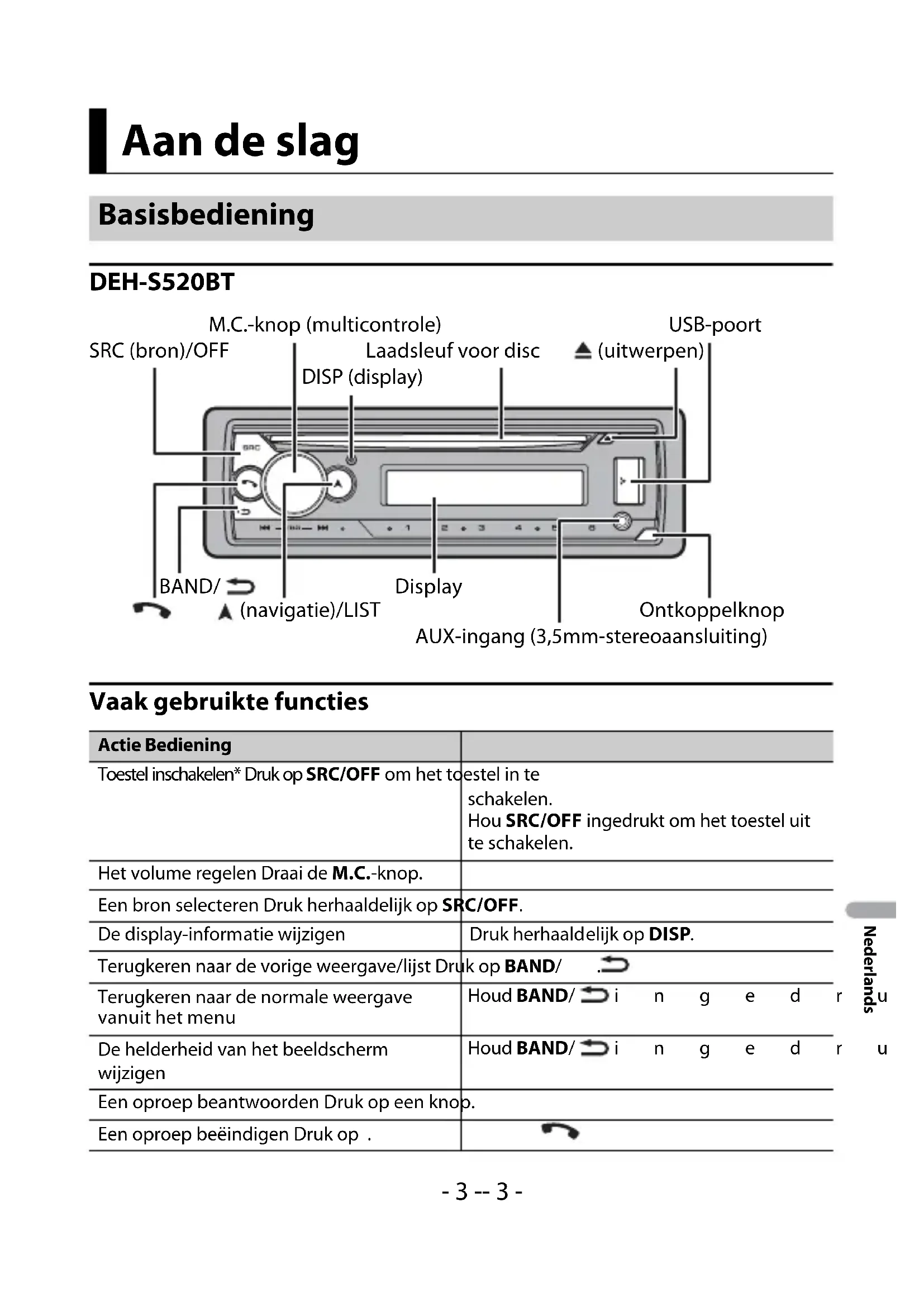 - In de volgende instructies worden een USB-geheugen of USB-audiospeler een “USB- apparaat” genoemd. Inhoud- 3 -- 3 - Nederlands DEH-S520BT Vaak gebruikte functies Aan de slag Basisbediening Actie Bediening Toestel inschakelen* Druk op SRC/OFF om het toestel in te schakelen. Hou SRC/OFF ingedrukt om het toestel uit te schakelen. Het volume regelen Draai de M.C.-knop. Een bron selecteren Druk herhaaldelijk op SRC/OFF. De display-informatie wijzigen Druk herhaaldelijk op DISP. Terugkeren naar de vorige weergave/lijst Druk op BAND/. Terugkeren naar de normale weergave vanuit het menu Houd BAND/ ingedrukt. De helderheid van het beeldscherm wijzigen Houd BAND/ ingedrukt. Een oproep beantwoorden Druk op een knop. Een oproep beëindigen Druk op . SRC (bron)/OFF Ontkoppelknop Display M.C.-knop (multicontrole) BAND/ DISP (display) (navigatie)/LIST USB-poort AUX-ingang (3,5mm-stereoaansluiting) (uitwerpen) Laadsleuf voor disc- 4 - Nederlands