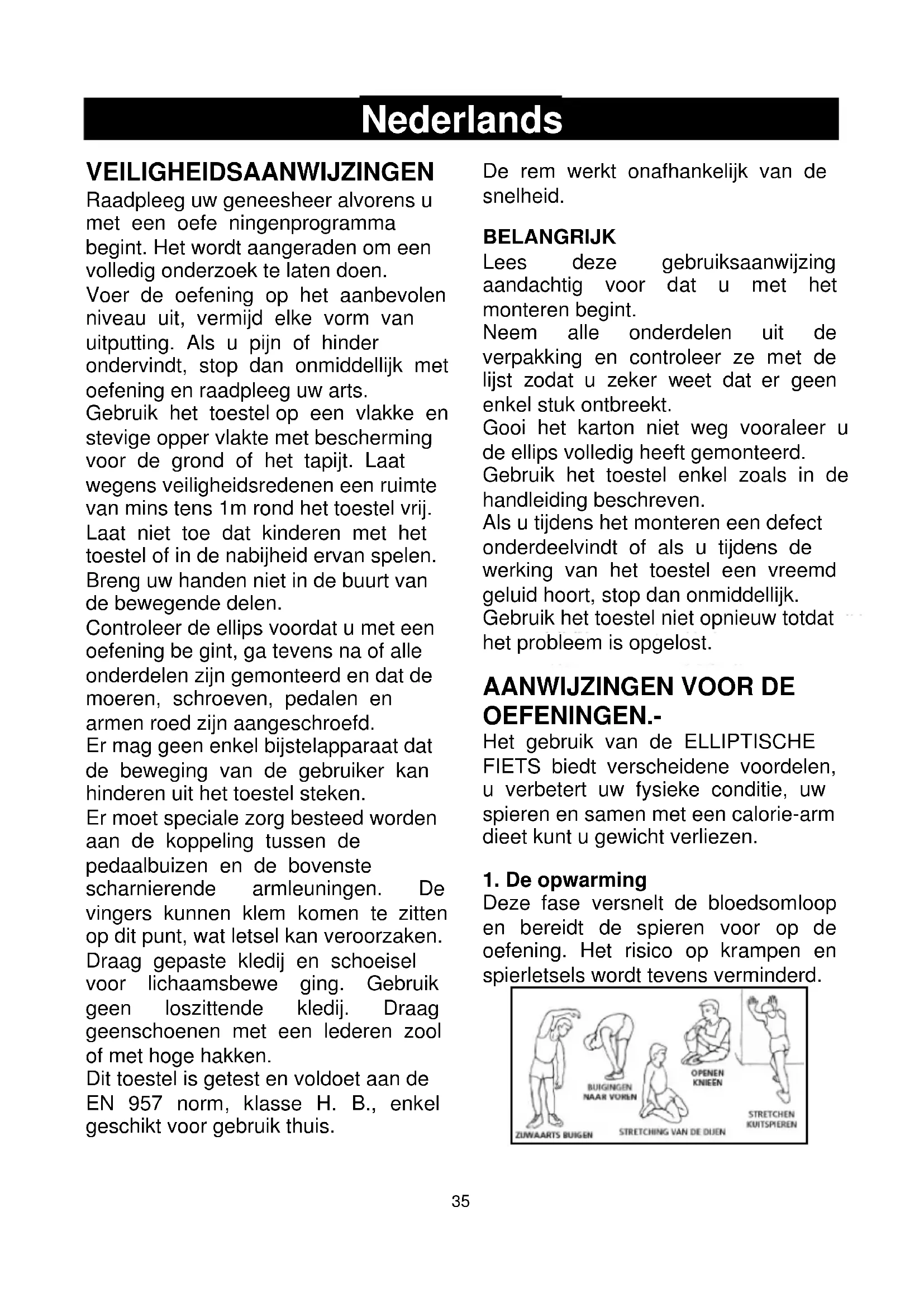 Nederlands VEILIGHEIDSAANWIJZINGEN Raadpleeg uw geneesheer alvorens u met een oefe ningenprogramma begint. Het wordt aangeraden om een volledig onderzoek te laten doen. Voer de oefening op het aanbevolen niveau uit, vermijd elke vorm van uitputting. Als u pijn of hinder ondervindt, stop dan onmiddellijk met oefening en raadpleeg uw arts. Gebruik het toestel op een vlakke en stevige opper vlakte met bescherming voor de grond of het tapijt. Laat wegens veiligheidsredenen een ruimte van mins tens 1m rond het toestel vrij. Laat niet toe dat kinderen met het toestel of in de nabijheid ervan spelen. Breng uw handen niet in de buurt van de bewegende delen. Controleer de ellips voordat u met een oefening be gint, ga tevens na of alle onderdelen zijn gemonteerd en dat de moeren, schroeven, pedalen en armen roed zijn aangeschroefd. Er mag geen enkel bijstelapparaat dat de beweging van de gebruiker kan hinderen uit het toestel steken. Er moet speciale zorg besteed worden aan de koppeling tussen de pedaalbuizen en de bovenste scharnierende armleuningen. De vingers kunnen klem komen te zitten op dit punt, wat letsel kan veroorzaken. Draag gepaste kledij en schoeisel voor lichaamsbewe ging. Gebruik geen loszittende kledij. Draag geenschoenen met een lederen zool of met hoge hakken. Dit toestel is getest en voldoet aan de EN 957 norm, klasse H. B., enkel geschikt voor gebruik thuis. De rem werkt onafhankelijk van de snelheid. BELANGRIJK Lees deze gebruiksaanwijzing aandachtig voor dat u met het monteren begint. Neem alle onderdelen uit de verpakking en controleer ze met de lijst zodat u zeker weet dat er geen enkel stuk ontbreekt. Gooi het karton niet weg vooraleer u de ellips volledig heeft gemonteerd. Gebruik het toestel enkel zoals in de handleiding beschreven. Als u tijdens het monteren een defect onderdeelvindt of als u tijdens de werking van het toestel een vreemd geluid hoort, stop dan onmiddellijk. Gebruik het toestel niet opnieuw totdat het probleem is opgelost.