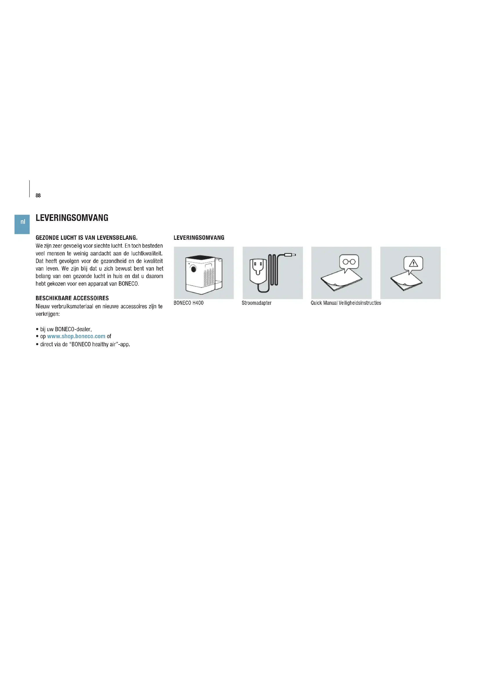 LEVERINGSOMVANG BONECO H400 LEVERINGSOMVANG Stroomadapter GEZONDE LUCHT IS VAN LEVENSBELANG. We zijn zeer gevoelig voor slechte lucht. En toch besteden veel mensen te weinig aandacht aan de luchtkwaliteit. Dat heeft gevolgen voor de gezondheid en de kwaliteit van leven. We zijn blij dat u zich bewust bent van het belang van een gezonde lucht in huis en dat u daarom hebt gekozen voor een apparaat van BONECO. BESCHIKBARE ACCESSOIRES Nieuw verbruiksmateriaal en nieuwe accessoires zijn te verkrijgen: