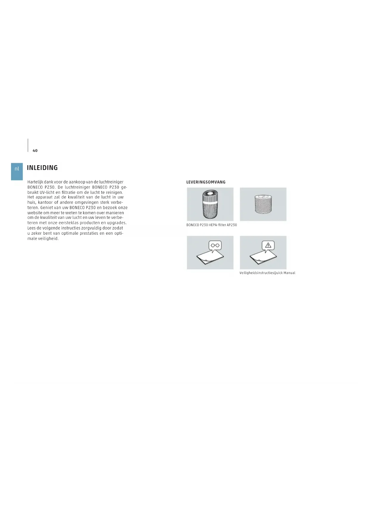 Hartelijk dank voor de aankoop van de luchtreiniger BONECO P250. De luchtreiniger BONECO P230 gebruikt UV-licht en filtratie om de lucht te reinigen. Het apparatusaal zal de kwaliteit van de lucht in uwuis, kantoort of andere omgeveen sterk verbetaerten. Geniet van uw BONECO P230 en bezoek once website ommeer te weten te komen over manieren om de kwaliteit van uw lucht en uw leven te verbetaerten met once eerstklas producten en upgrades. Lees de volgende instructies zorgvuldig door zatat uzeker bent van optimale prestaties en een optimaavigilheid.