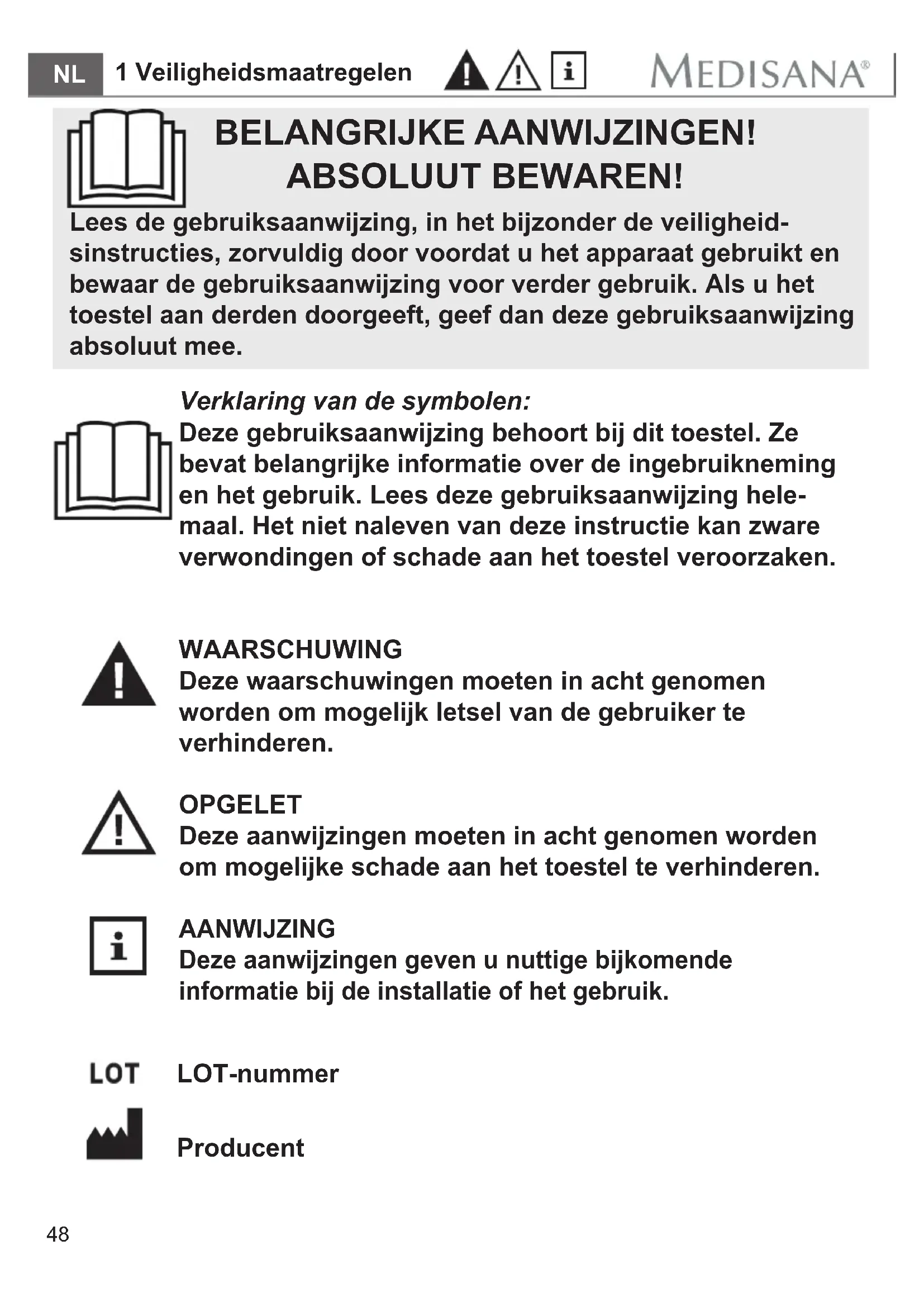 Producent BELANGRIJKE AANWIJZINGEN! ABSOLUUT BEWAREN! Lees de gebruiksaanwijzing, in het bijzonder de veiligheid- sinstructies, zorvuldig door voordat u het apparaat gebruikt en bewaar de gebruiksaanwijzing voor verder gebruik. Als u het toestel aan derden doorgeeft, geef dan deze gebruiksaanwijzing absoluut mee.49