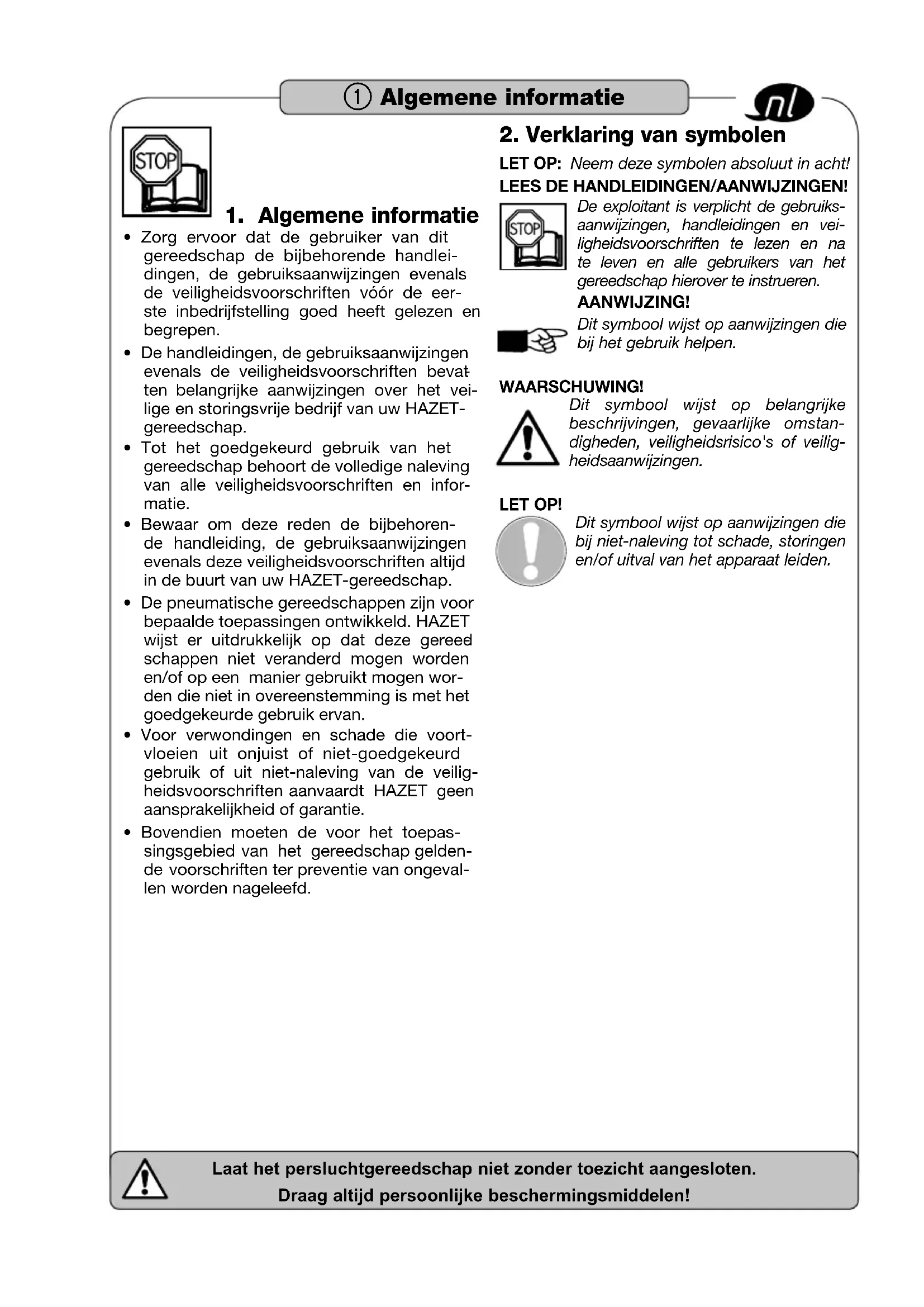 LET OP: Neem deze symbolen absoluut in acht! LEES DE HANDLEIDINGEN/AANWIJZINGEN! De exploitant is verplicht de gebruiks- aanwijzingen, handleidingen en vei- ligheidsvoorschriften te lezen en na te leven en alle gebruikers van het gereedschap hierover te instrueren. AANWIJZING! Dit symbool wijst op aanwijzingen die bij het gebruik helpen. WAARSCHUWING! Dit symbool wijst op belangrijke beschrijvingen, gevaarlijke omstan- digheden, veiligheidsrisico's of veilig- heidsaanwijzingen. LET OP! Dit symbool wijst op aanwijzingen die bij niet -naleving tot schade, storingen en/of uitval van het apparaat leiden.38 Laat het persluchtgereedschap niet zonder toezicht aangesloten. Draag altijd persoonlijke beschermingsmiddelen!