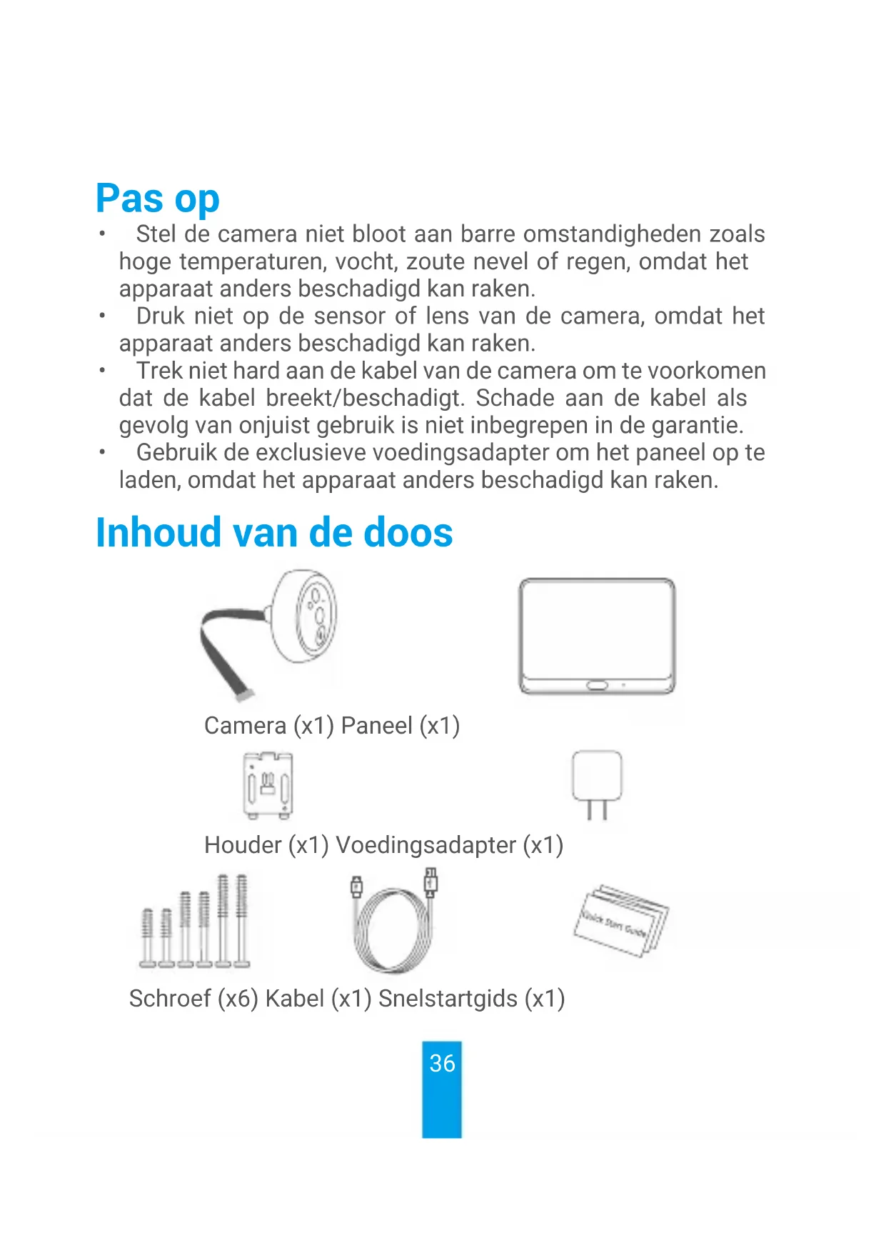 - Gebruik de exclusieve voedingsadapter om het paneel op te laden, omdat het apparaat anders beschadigd kan raken. Inhoud van de doos Camera (x1) Paneel (x1) Houder (x1) Voedingsadapter (x1) Schroef (x6) Kabel (x1) Snelstartgids (x1)37 Overzicht Paneel Aan-/uitknop Beeldscherm MicroSD-kaartsleuf Startknop Voedingsaansluiting LuidsprekerDemontageknop Camera Sensor Bel Sensor Luidspreker Lens Microfoon38 Montagevoet Montagegat Installatie Als u al een kijkgaatje hebt, installeer het apparaat dan op dezelfde plaats. Zo niet, boor dan voor een goed zicht een gat met een diameter van ongeveer 18 mm en op een hoogte van ongeveer 145 cm. Meet de dikte van de deur en gebruik de juiste schroef. Dikte Schroef 35 tot 60 mm 60 tot 95 mm 95 tot 105 mm39 Draai de schroef in de achterzijde van de camera. Verwijder het beschermpapier. Leid de schroef en de draad door de deur. U kunt er een stuk papier omheen rollen om bij het doorvoeren te helpen. Pas de positie van de camera aan en duw deze voorzichtig dicht tegen de deur aan. Leid de schroeven en de kabel door de houder. Verstel de positie van de houder en draai de schroef vast.40 Verbind het paneel met de kabel van de camera. Plaats het paneel in de houder. Houd de demontageknop ingedrukt totdat het paneel stevig vastzit. De installatie is voltooid. Inschakelen Houd de aan-/uitknop 3 seconden ingedrukt om het paneel in te schakelen. Tik op de startknop om voor live-weergave.41 Aan EZVIZ-app toevoegen Een gebruikersaccount aanmaken. - Verbinduwmobieletelefoonmetwi(aanbevolen). - Zoek naar EZVIZ in App Store of Google Play