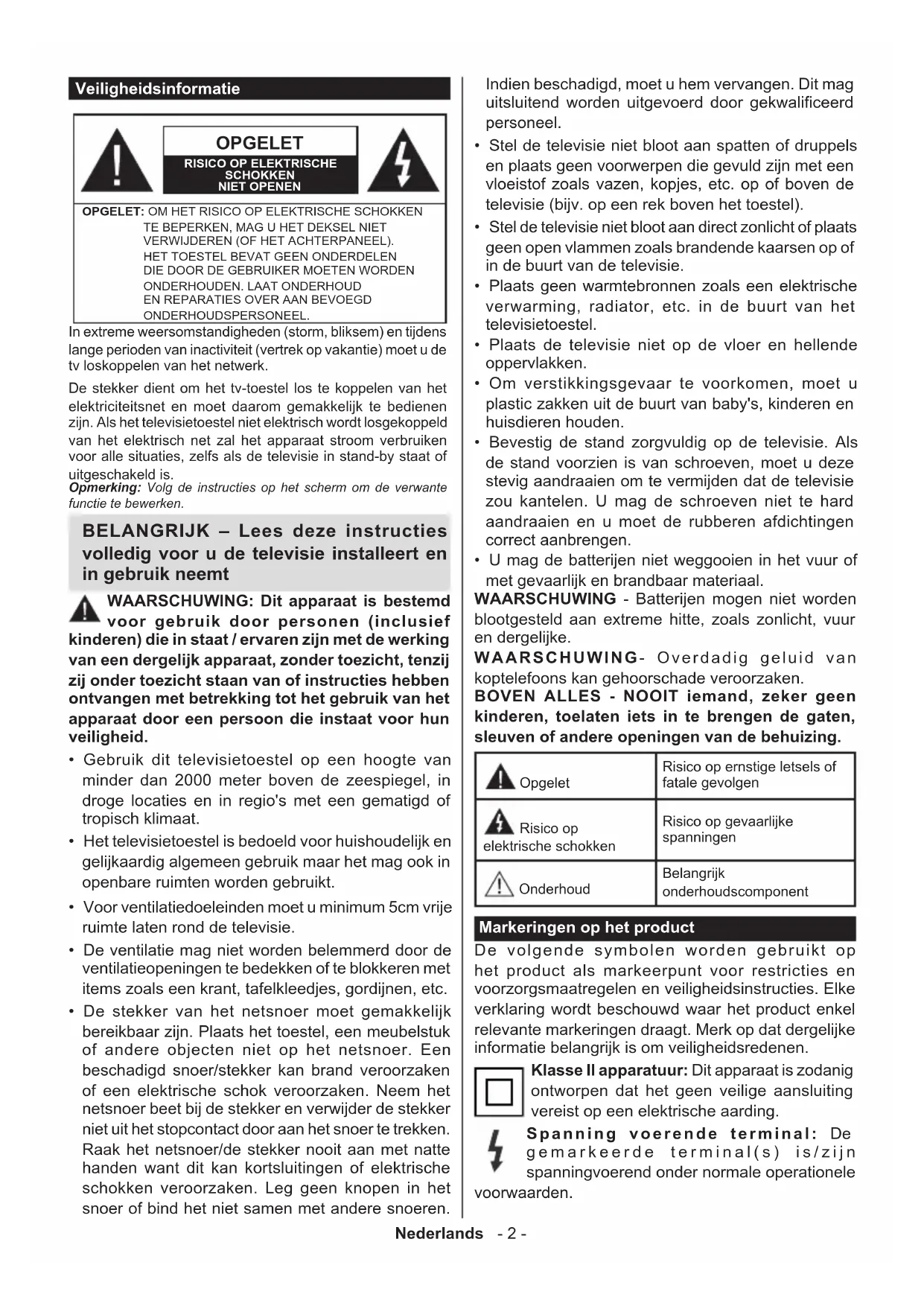 - U mag de batterijen niet weggooien in het vuur of met gevaarlijk en brandbaar materiaal. WAARSCHUWING - Batterijen mogen niet worden blootgesteld aan extreme hitte, zoals zonlicht, vuur en dergelijke. WAARSCHUWING- Overdadig geluid van koptelefoons kan gehoorschade veroorzaken. BOVEN ALLES - NOOIT iemand, zeker geen kinderen, toelaten iets in te brengen de gaten, sleuven of andere openingen van de behuizing. Opgelet Risico op ernstige letsels of fatale gevolgen Risico op elektrische schokken Risico op gevaarlijke spanningen Onderhoud Belangrijk onderhoudscomponent Markeringen op het product De volgende symbolen worden gebruikt op het product als markeerpunt voor restricties en voorzorgsmaatregelen en veiligheidsinstructies. Elke verklaring wordt beschouwd waar het product enkel relevante markeringen draagt. Merk op dat dergelijke informatie belangrijk is om veiligheidsredenen. Klasse II apparatuur: Dit apparaat is zodanig ontworpen dat het geen veilige aansluiting vereist op een elektrische aarding. Spanning voerende terminal: De gemarkeerde terminal(s) is/zijn spanningvoerend onder normale operationele voorwaarden.Nederlands - 3 -