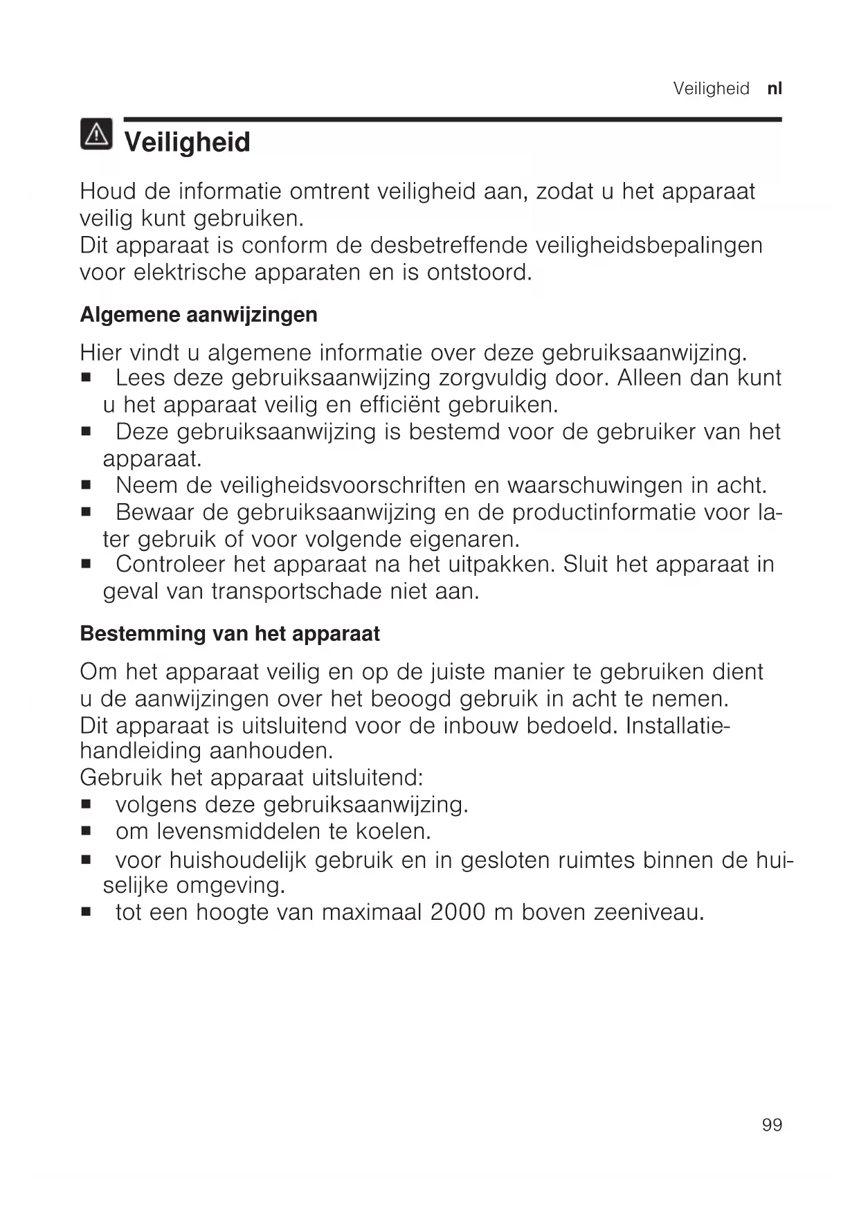 Veiligheid Houd de informatie omtrent veiligheid aan, zodat u het apparaat veilig kunt gebruiken. Dit apparaat is conform de desbetreffende veiligheidsbepalingen voor elektrische apparaten en is ontstoord. Algemene aanwijzingen Hier vindt u algemene informatie over deze gebruiksaanwijzing. ¡ Lees deze gebruiksaanwijzing zorgvuldig door. Alleen dan kunt u het apparaat veilig en efficiënt gebruiken. ¡ Deze gebruiksaanwijzing is bestemd voor de gebruiker van het apparaat. ¡ Neem de veiligheidsvoorschriften en waarschuwingen in acht. ¡ Bewaar de gebruiksaanwijzing en de productinformatie voor la- ter gebruik of voor volgende eigenaren. ¡ Controleer het apparaat na het uitpakken. Sluit het apparaat in geval van transportschade niet aan. Bestemming van het apparaat Om het apparaat veilig en op de juiste manier te gebruiken dient u de aanwijzingen over het beoogd gebruik in acht te nemen. Dit apparaat is uitsluitend voor de inbouw bedoeld. Installatie- handleiding aanhouden. Gebruik het apparaat uitsluitend: ¡ volgens deze gebruiksaanwijzing. ¡ om levensmiddelen te koelen. ¡ voor huishoudelijk gebruik en in gesloten ruimtes binnen de hui- selijke omgeving. ¡ tot een hoogte van maximaal 2000m boven zeeniveau.nl Veiligheid