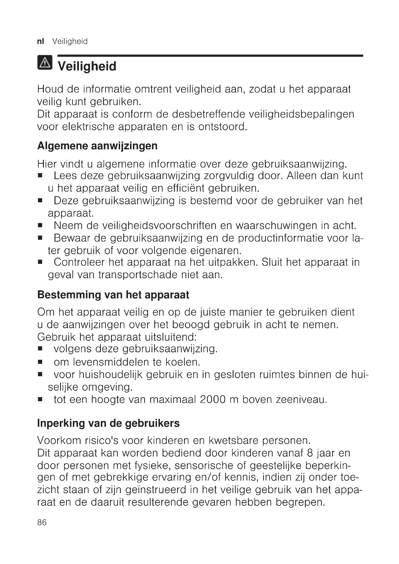 Veiligheid Houd de informatie omtrent veiligheid aan, zodat u het apparaat veilig kunt gebruiken. Dit apparaat is conform de desbetreffende veiligheidsbepalingen voor elektrische apparaten en is ontstoord. Algemene aanwijzingen Hier vindt u algemene informatie over deze gebruiksaanwijzing. ¡ Lees deze gebruiksaanwijzing zorgvuldig door. Alleen dan kunt u het apparaat veilig en efficiënt gebruiken. ¡ Deze gebruiksaanwijzing is bestemd voor de gebruiker van het apparaat. ¡ Neem de veiligheidsvoorschriften en waarschuwingen in acht. ¡ Bewaar de gebruiksaanwijzing en de productinformatie voor la- ter gebruik of voor volgende eigenaren. ¡ Controleer het apparaat na het uitpakken. Sluit het apparaat in geval van transportschade niet aan. Bestemming van het apparaat Om het apparaat veilig en op de juiste manier te gebruiken dient u de aanwijzingen over het beoogd gebruik in acht te nemen. Gebruik het apparaat uitsluitend: ¡ volgens deze gebruiksaanwijzing. ¡ om levensmiddelen te koelen. ¡ voor huishoudelijk gebruik en in gesloten ruimtes binnen de hui- selijke omgeving. ¡ tot een hoogte van maximaal 2000m boven zeeniveau. Inperking van de gebruikers Voorkom risico's voor kinderen en kwetsbare personen. Dit apparaat kan worden bediend door kinderen vanaf 8 jaar en door personen met fysieke, sensorische of geestelijke beperkin- gen of met gebrekkige ervaring en/of kennis, indien zij onder toe- zicht staan of zijn geïnstrueerd in het veilige gebruik van het appa- raat en de daaruit resulterende gevaren hebben begrepen.Veiligheid nl