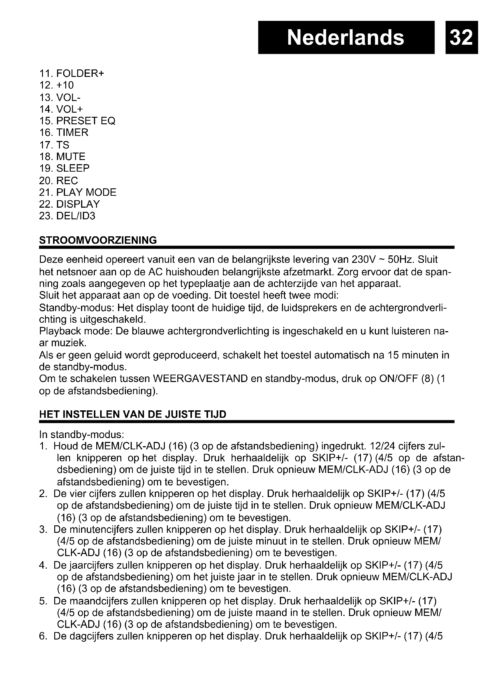 1. Houd de MEM/CLK-ADJ (16) (3 op de afstandsbediening) ingedrukt. 12/24 cijfers zullen knipperen op het display. Druk herhaaldelijk op SKIP+/- (17) (4/5 op de afstandsbediening) om de juisteijd in te stellen. Druk opnieuw MEM/CLK-ADJ (16) (3 op de afstandsbediening) om te bevestigen.