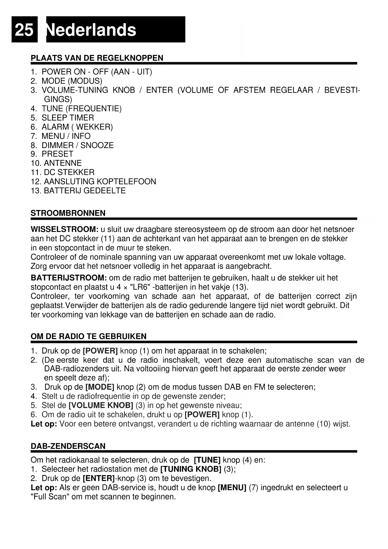 STROOMBRONNEN WISSELSTROOM: u sluit uw draagbare stereosysteem op de stroom aan door het netsnoer aan het DC stekker (11) aan de achterkant van het apparaat aan te brengen en de stekker in een stopcontact in de muur te steken. Controleer of de nominale spanning van uw apparaat overeenkomt met uw lokale voltage. Zorg ervoor dat het netsnoer volledig in het apparaat is aangebracht. BATTERIJSTROOM: om de radio met batterijen te gebruiken, haalt u de stekker uit het stopcontact en plaatst u 4 × "LR6" -batterijen in het vakje (13). Controleer, ter voorkoming van schade aan het apparaat, of de batterijen correct zijn geplaatst.Verwijder de batterijen als de radio gedurende langere tijd niet wordt gebruikt. Dit ter voorkoming van lekkage van de batterijen en schade aan de radio.