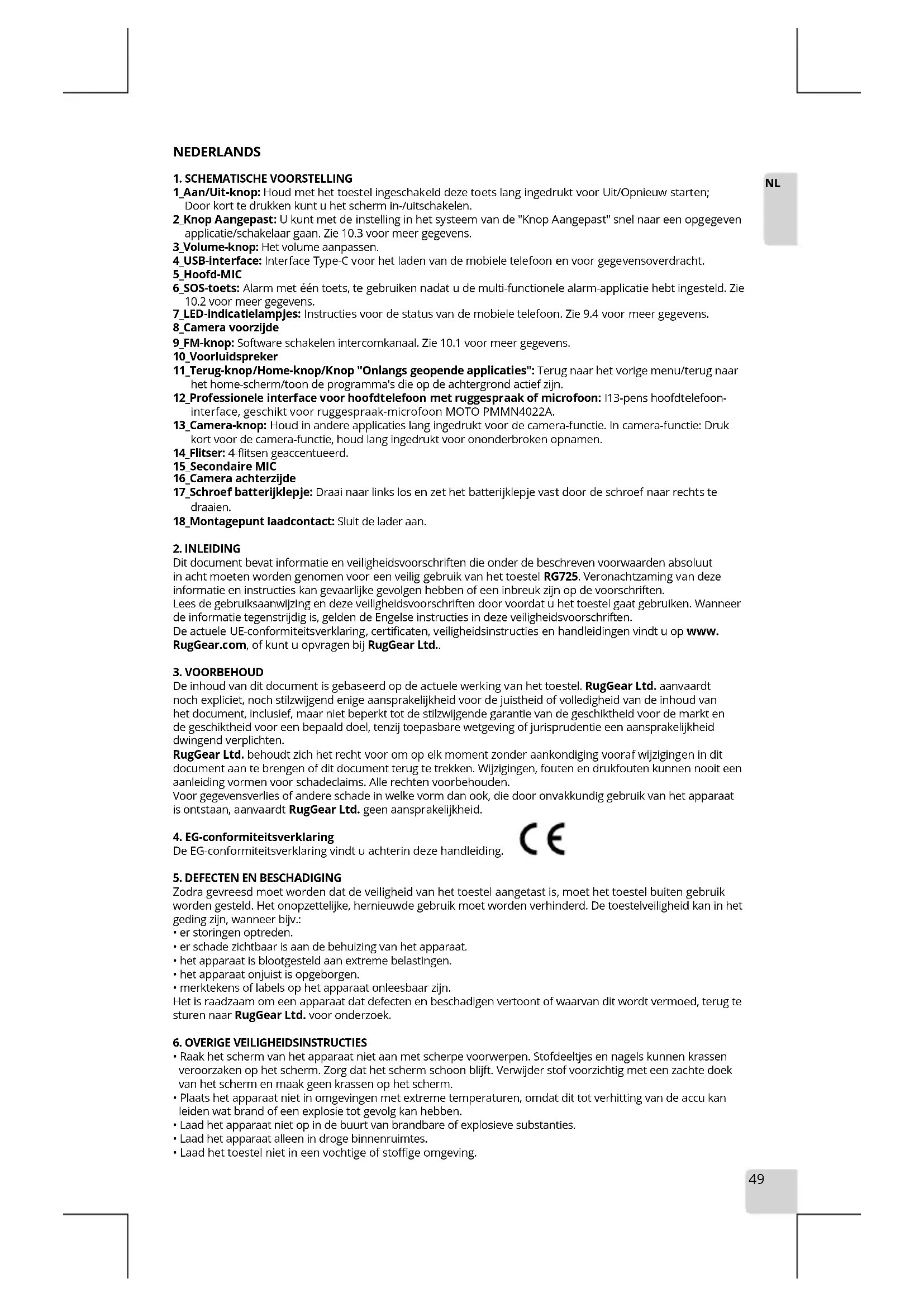 Dit document bevat informatie en veiligheidsvoorschriften die onder de beschreven voorwaarden absoluut in acht moeten worden genomen voor een veilig gebruik van het toestel RG725. Veronachtzaming van deze informatie en instructies kan gevaarlijke gevolgen hebben of een inbreuk zijn op de voorschriften. Lees de gebruiksaanwijzing en deze veiligheidsvoorschriften door voordat u het toestel gaat gebruiken. Wanneer de informatie tegenstrijdig is, gelden de Engelse instructies in deze veiligheidsvoorschriften. De actuele UE-conformiteitsverklaring, certificaten, veiligheidsinstructies en handleidingen vindt u op www. RugGear.com, of kunt u opvragen bij RugGear Ltd..