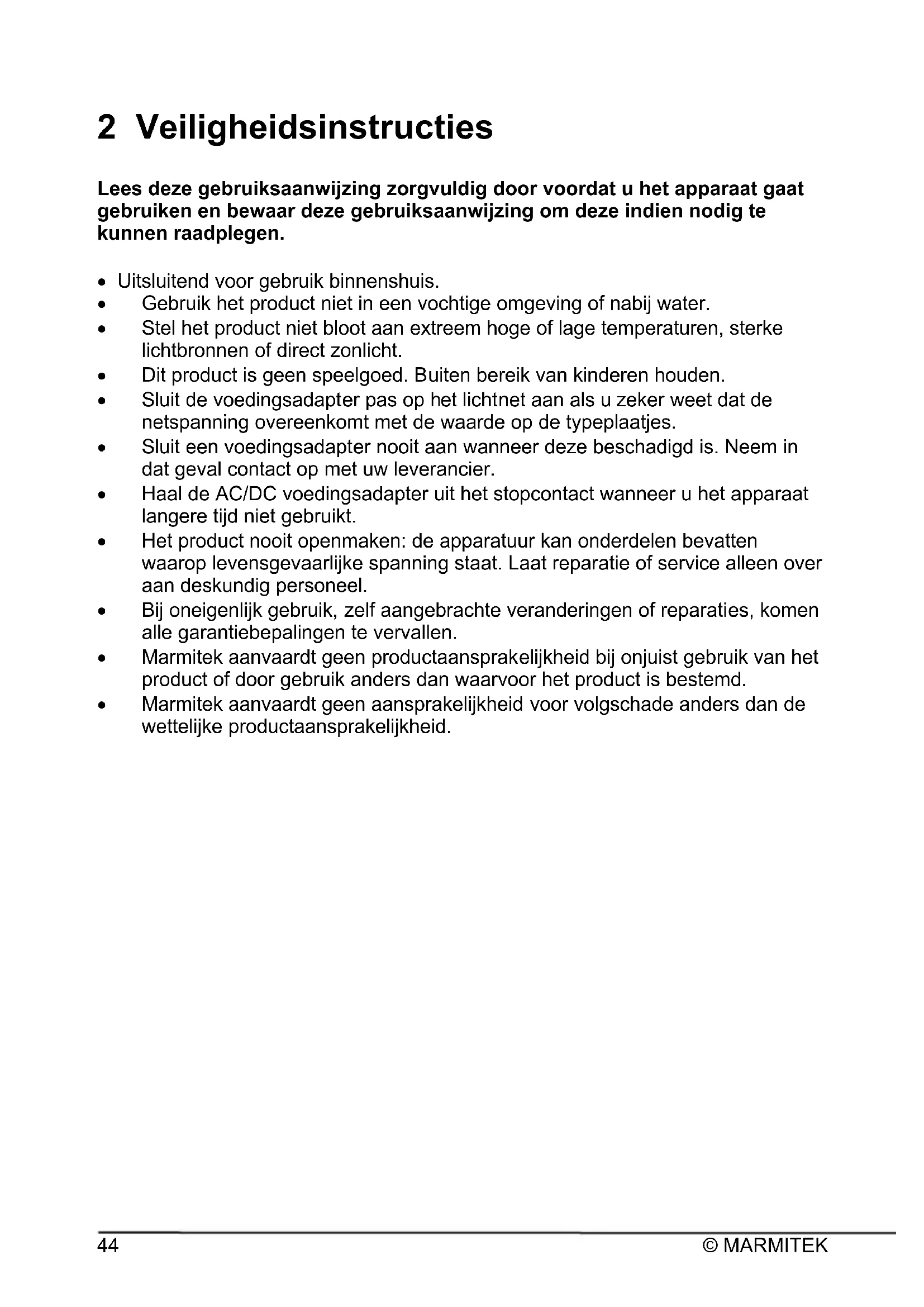 2 Veiligheidsinstructies Lees deze gebruiksaanwijzing zorgvuldig door voordat u het apparaat gaat gebruiken en bewaar deze gebruiksaanwijzing om deze indien nodig te kunnen raadplegen. Uitsluitend voor gebruik binnenshuis. Gebruik het product niet in een vochtige omgeving of nabij water. Stel het product niet bloot aan extreem hoge of lage temperaturen, sterke lichtbronnen of direct zonlicht. Dit product is geen speelgoed. Buiten bereik van kinderen houden. Sluit de voedingsadapter pas op het lichtnet aan als u zeker weet dat de netspanning overeenkomt met de waarde op de typeplaatjes. Sluit een voedingsadapter nooit aan wanneer deze beschadigd is. Neem in dat geval contact op met uw leverancier. Haal de AC/DC voedingsadapter uit het stopcontact wanneer u het apparaat langere tijd niet gebruikt. Het product nooit openmaken: de apparatuur kan onderdelen bevatten waarop levensgevaarlijke spanning staat. Laat reparatie of service alleen over aan deskundig personeel. Bij oneigenlijk gebruik, zelf aangebrachte veranderingen of reparaties, komen alle garantiebepalingen te vervallen. Marmitek aanvaardt geen productaansprakelijkheid bij onjuist gebruik van het product of door gebruik anders dan waarvoor het product is bestemd. Marmitek aanvaardt geen aansprakelijkheid voor volgschade anders dan de wettelijke productaansprakelijkheid.SPLIT 612 UHD 2.0™