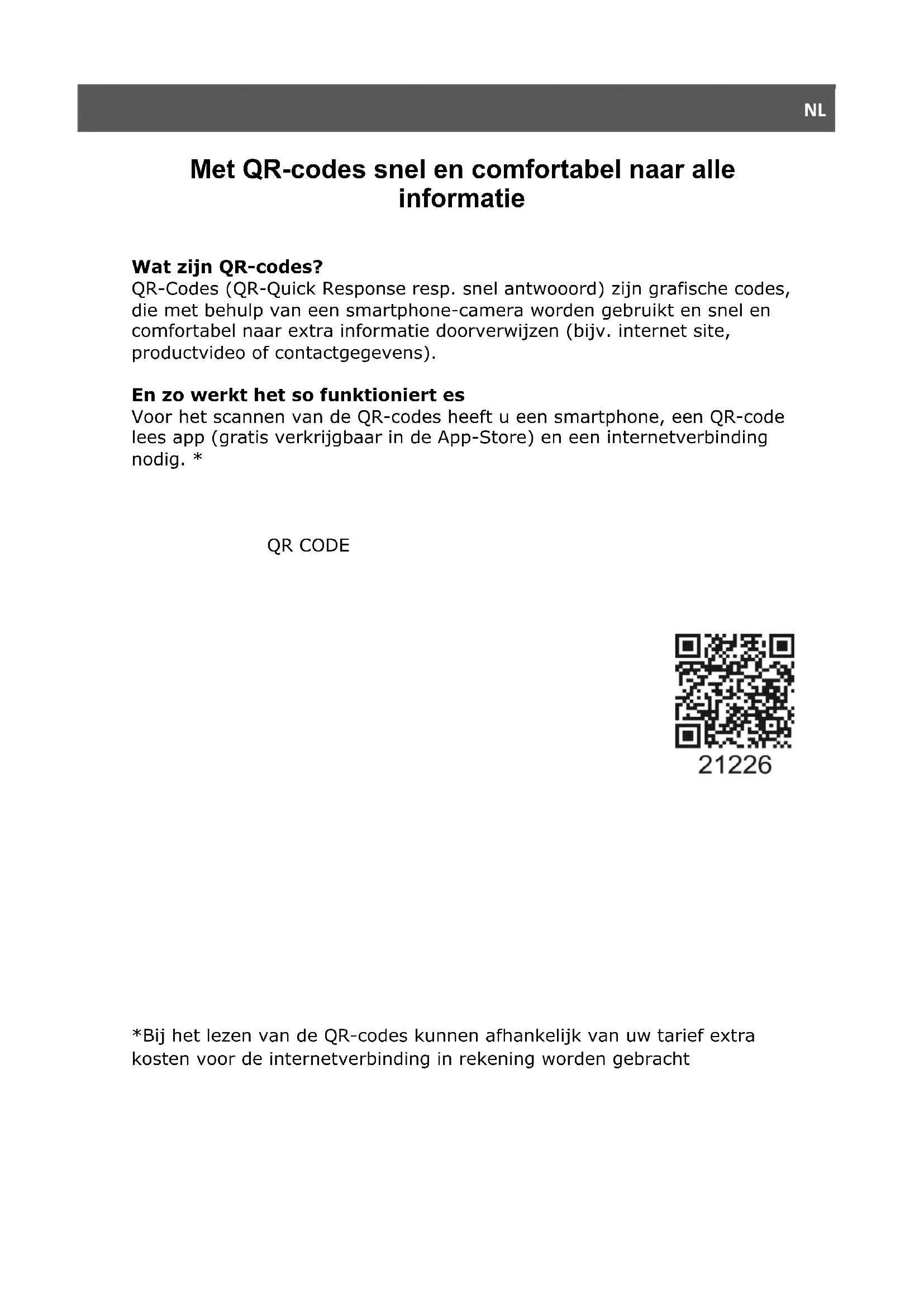 Wat zijn QR-codes? QR-Codes (QR-Quick Response resp. snel antwooord) zijn grafische codes, die met behulp van een smartphone-camera worden gebruikt en snel en comfortabel naar extra informatie doorverwijzen (bijv. internet site, productvideo of contactgegevens). En zo werkt het so funktioniert es Voor het scannen van de QR-codes heeft u een smartphone, een QR-code lees app (gratis verkrijgbaar in de App-Store) en een internetverbinding nodig. *