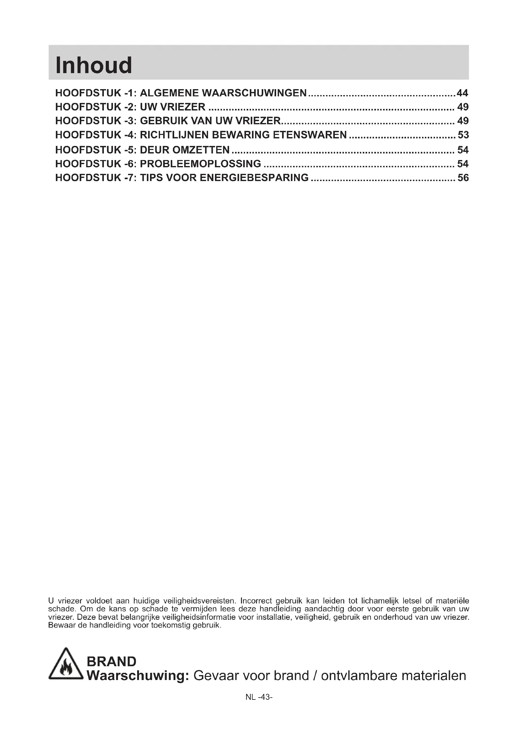 Si vous avez besoin d’assistance, contactez la HOTLINE CONSOMMATEUR ou le service après-vente pour des informations complémentaires au numéro suivant : HOTLINE CONSOMMATEUR Ouvert du lundi au vendredi de 9h00 à 18h30 Et le samedi de 9h00 à 17h30NL -43- U vriezer voldoet aan huidige veiligheidsvereisten. Incorrect gebruik kan leiden tot lichamelijk letsel of materiële schade. Om de kans op schade te vermijden lees deze handleiding aandachtig door voor eerste gebruik van uw vriezer. Deze bevat belangrijke veiligheidsinformatie voor installatie, veiligheid, gebruik en onderhoud van uw vriezer. Bewaar de handleiding voor toekomstig gebruik. Inhoud