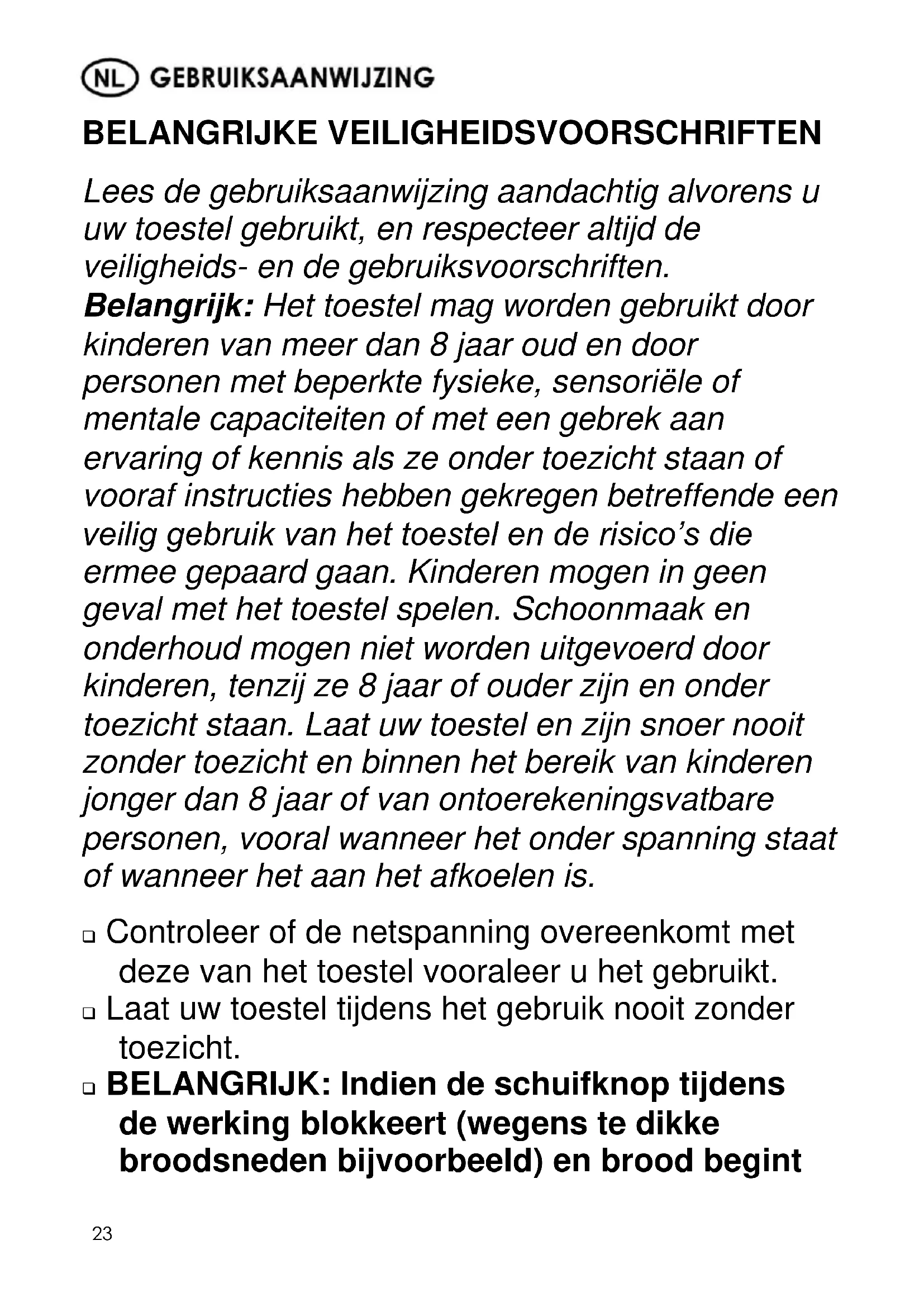BELANGRIJKE VEILIGHEIDSVOORSCHRIFTEN Lees de gebruiksaanwijzing aandachtig alvorens u uw toestel gebruikt, en respecteer altijd de veiligheids- en de gebruiksvoorschriften. Belangrijk: Het toestel mag worden gebruikt door kinderen van meer dan 8 jaar oud en door personen met beperkte fysieke, sensoriële of mentale capaciteiten of met een gebrek aan ervaring of kennis als ze onder toezicht staan of vooraf instructies hebben gekregen betreffende een veilig gebruik van het toestel en de risico’s die ermee gepaard gaan. Kinderen mogen in geen geval met het toestel spelen. Schoonmaak en onderhoud mogen niet worden uitgevoerd door kinderen, tenzij ze 8 jaar of ouder zijn en onder toezicht staan. Laat uw toestel en zijn snoer nooit zonder toezicht en binnen het bereik van kinderen jonger dan 8 jaar of van ontoerekeningsvatbare personen, vooral wanneer het onder spanning staat of wanneer het aan het afkoelen is. Controleer of de netspanning overeenkomt met deze van het toestel vooraleer u het gebruikt. Laat uw toestel tijdens het gebruik nooit zonder toezicht. BELANGRIJK: Indien de schuifknop tijdens de werking blokkeert (wegens te dikke broodsneden bijvoorbeeld) en brood begint24
