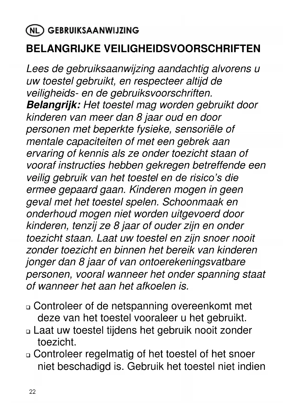 BELANGRIJKE VEILIGHEIDSVOORSCHRIFTEN Lees de gebruiksaanwijzing aandachtig alvorens u uw toestel gebruikt, en respecteer altijd de veiligheids- en de gebruiksvoorschriften. Belangrijk: Het toestel mag worden gebruikt door kinderen van meer dan 8 jaar oud en door personen met beperkte fysieke, sensoriële of mentale capaciteiten of met een gebrek aan ervaring of kennis als ze onder toezicht staan of vooraf instructies hebben gekregen betreffende een veilig gebruik van het toestel en de risico’s die ermee gepaard gaan. Kinderen mogen in geen geval met het toestel spelen. Schoonmaak en onderhoud mogen niet worden uitgevoerd door kinderen, tenzij ze 8 jaar of ouder zijn en onder toezicht staan. Laat uw toestel en zijn snoer nooit zonder toezicht en binnen het bereik van kinderen jonger dan 8 jaar of van ontoerekeningsvatbare personen, vooral wanneer het onder spanning staat of wanneer het aan het afkoelen is. Controleer of de netspanning overeenkomt met deze van het toestel vooraleer u het gebruikt. Laat uw toestel tijdens het gebruik nooit zonder toezicht. Controleer regelmatig of het toestel of het snoer niet beschadigd is. Gebruik het toestel niet indien23