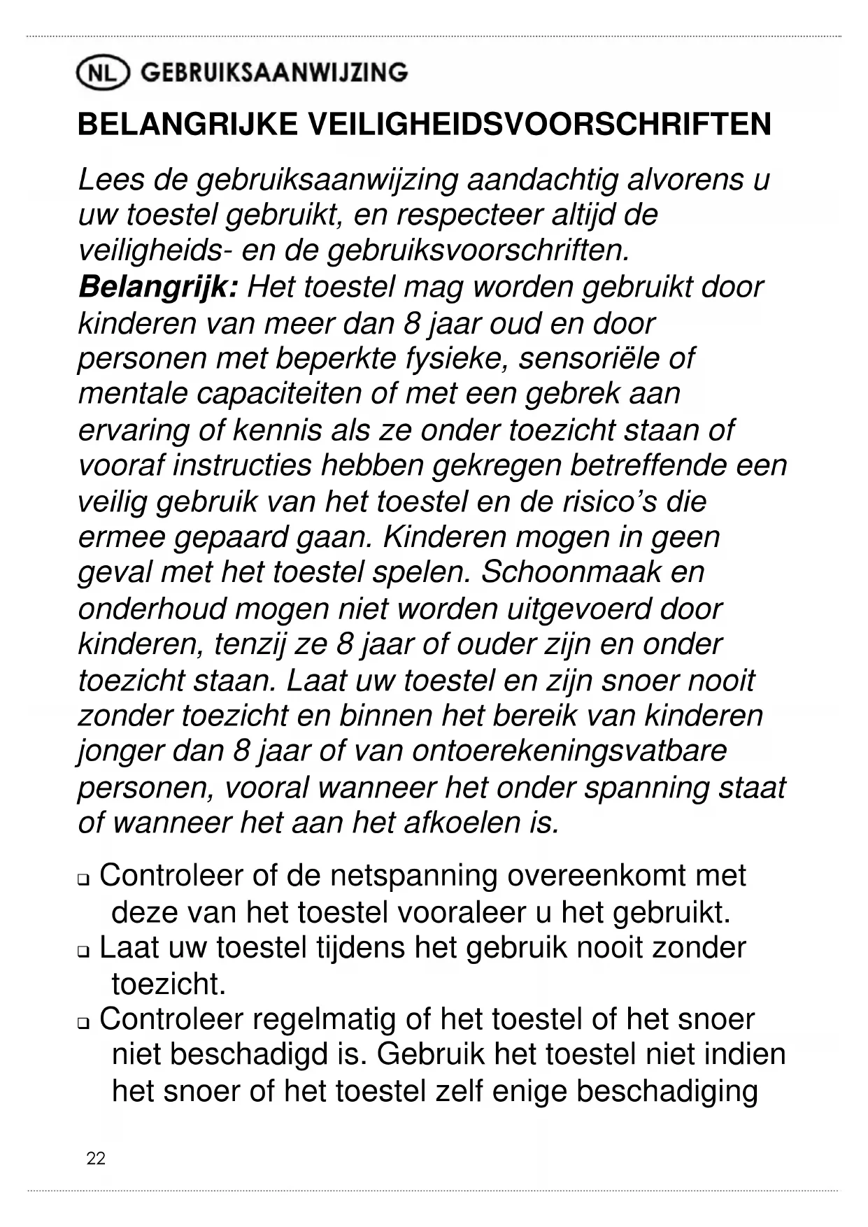 BELANGRIJKE VEILIGHEIDSVOORSCHRIFTEN Lees de gebruiksaanwijzing aandachtig alvorens u uw toestel gebruikt, en respecteer altijd de veiligheids- en de gebruiksvoorschriften. Belangrijk: Het toestel mag worden gebruikt door kinderen van meer dan 8 jaar oud en door personen met beperkte fysieke, sensoriële of mentale capaciteiten of met een gebrek aan ervaring of kennis als ze onder toezicht staan of vooraf instructies hebben gekregen betreffende een veilig gebruik van het toestel en de risico’s die ermee gepaard gaan. Kinderen mogen in geen geval met het toestel spelen. Schoonmaak en onderhoud mogen niet worden uitgevoerd door kinderen, tenzij ze 8 jaar of ouder zijn en onder toezicht staan. Laat uw toestel en zijn snoer nooit zonder toezicht en binnen het bereik van kinderen jonger dan 8 jaar of van ontoerekeningsvatbare personen, vooral wanneer het onder spanning staat of wanneer het aan het afkoelen is. Controleer of de netspanning overeenkomt met deze van het toestel vooraleer u het gebruikt. Laat uw toestel tijdens het gebruik nooit zonder toezicht. Controleer regelmatig of het toestel of het snoer niet beschadigd is. Gebruik het toestel niet indien het snoer of het toestel zelf enige beschadiging23