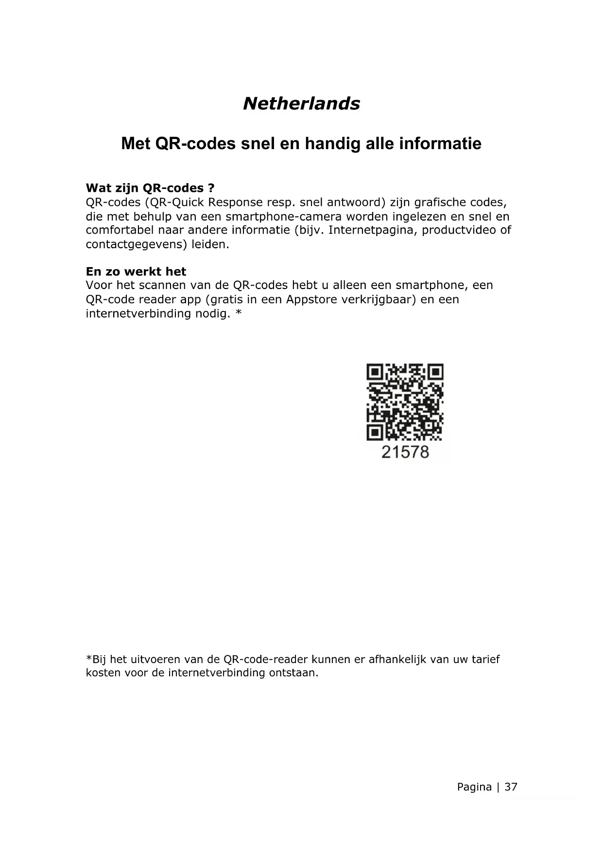 *Bij het uitvoeren van de QR-code-reader kunnen er afhankelijk van uw tarief kosten voor de internetverbinding ontstaan.Pagina | 38