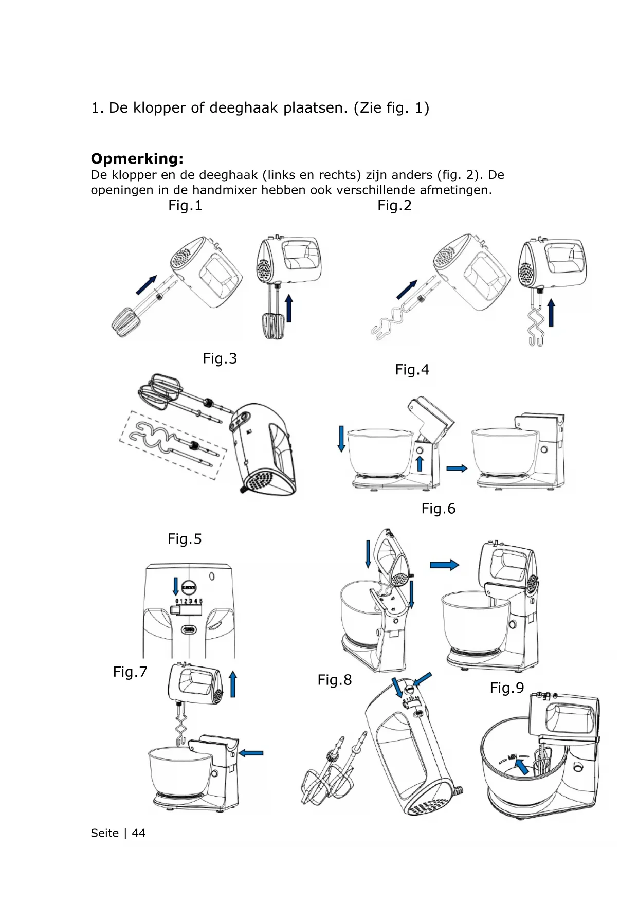 1. De klopper of deeghaak plaatsen. (Zie fig. 1)