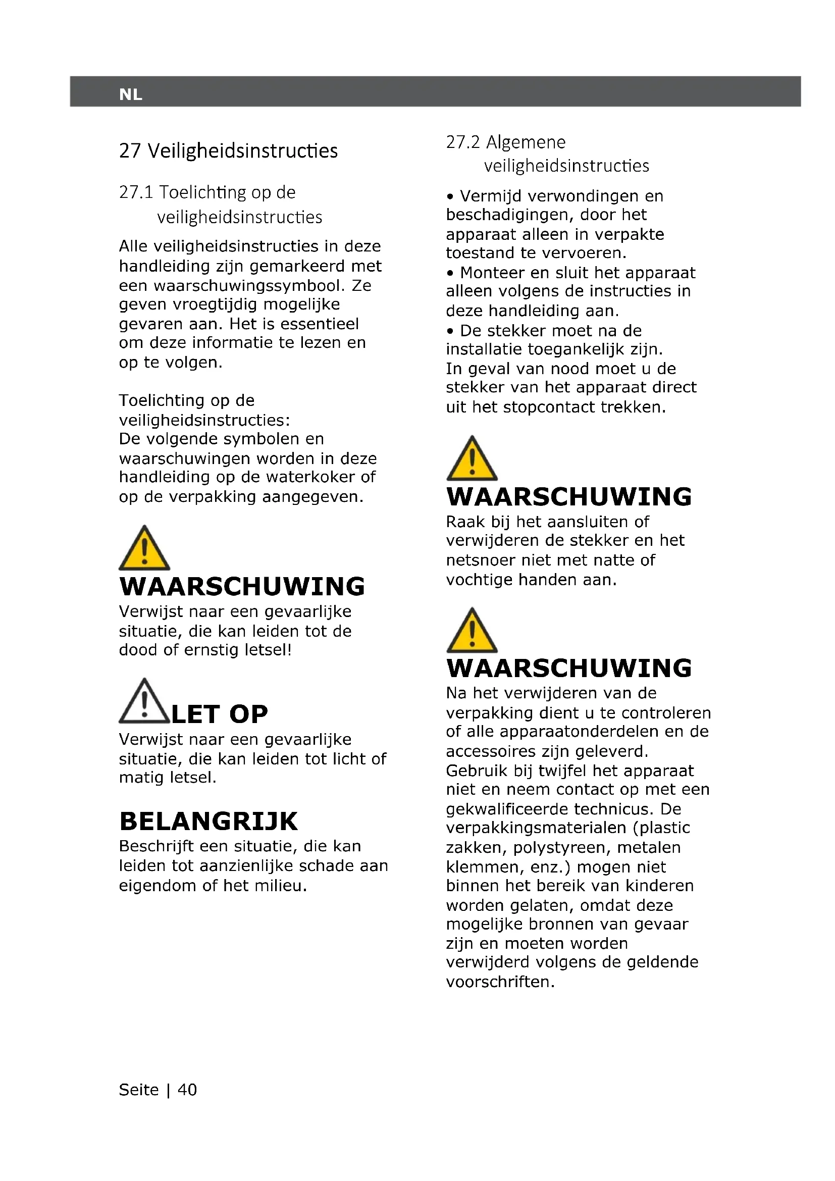veiligheidsinstructies Alle veiligheidsinstructies in deze handleiding zijn gemarkeerd met een waarschuwingssymbool. Ze geven vroegtijdig mogelijke gevaren aan. Het is essentieel om deze informatie te lezen en op te volgen. Toelichting op de veiligheidsinstructies: De volgende symbolen en waarschuwingen worden in deze handleiding op de waterkoker of op de verpakking aangegeven.