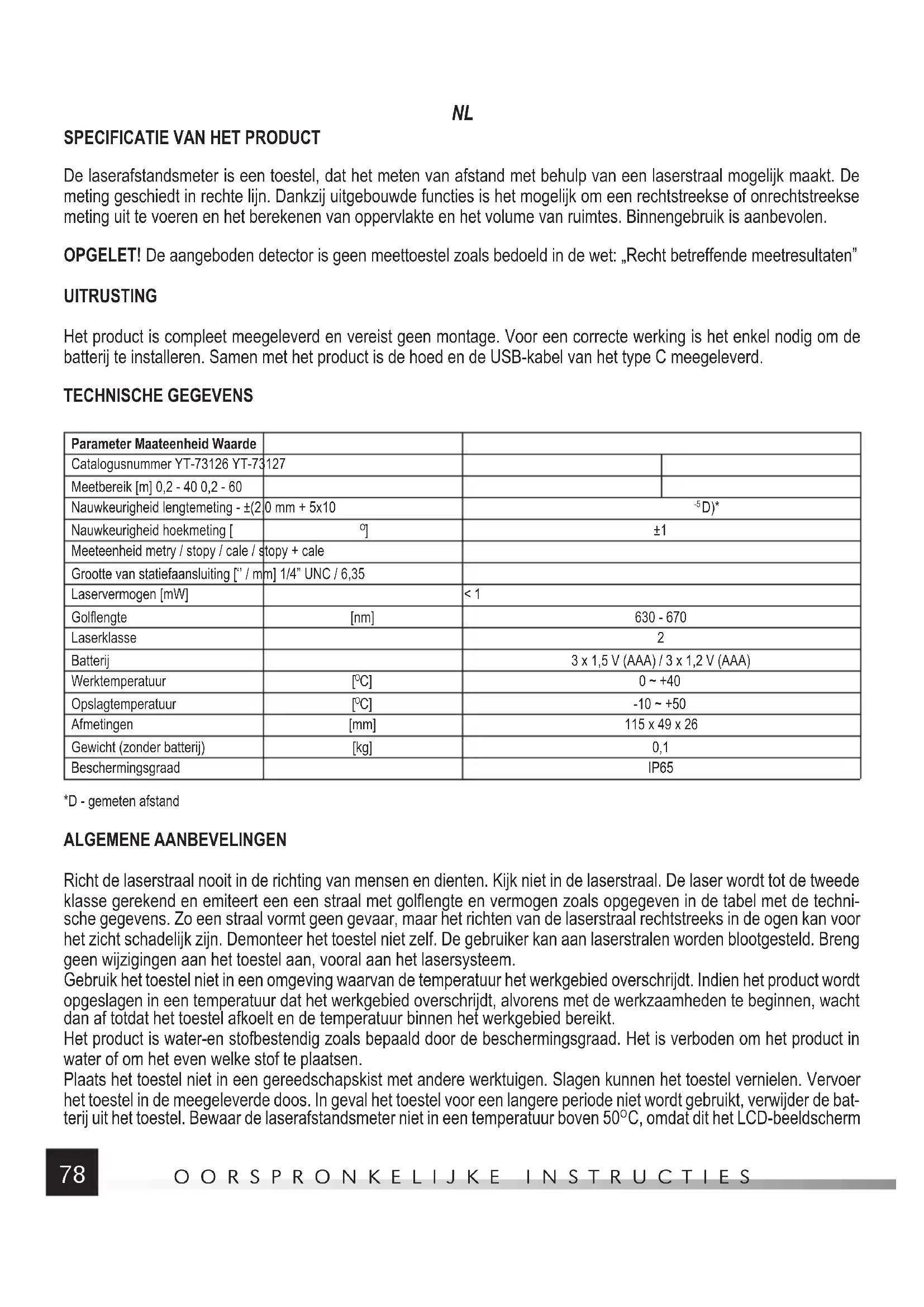 De laserafstandsmeter is een toestel, dat het meten van afstand met behulp van een laserstraal mogelijk maakt. De meting geschiedt in rechte lijn. Dankzij uitgebouwde functies is het mogelijk om een rechtstreekse of onrechtstreekse meting uit te voeren en het berekenen van oppervlakte en het volume van ruimtes. Binnengebruik is aanbevolen. OPGELET! De aangeboden detector is geen meettoestel zoals bedoeld in de wet: „Recht betreffende meetresultaten” UITRUSTING Het product is compleet meegeleverd en vereist geen montage. Voor een correcte werking is het enkel nodig om de batterij te installeren. Samen met het product is de hoed en de USB-kabel van het type C meegeleverd. TECHNISCHE GEGEVENS Parameter Maateenheid Waarde Catalogusnummer YT-73126 YT-73127 Meetbereik [m] 0,2 - 40 0,2 - 60 Nauwkeurigheid lengtemeting - ±(2,0 mm + 5x10