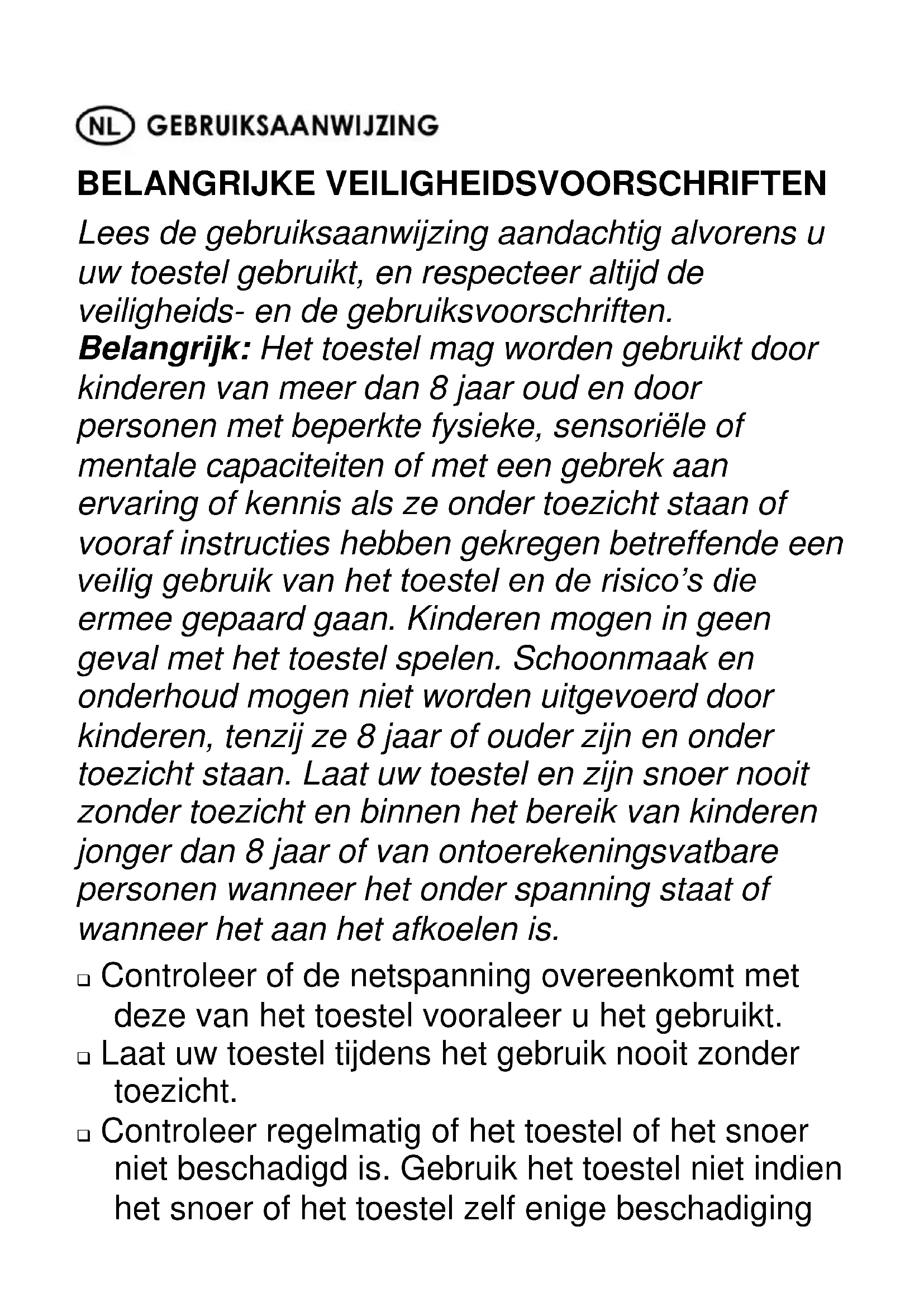 BELANGRIJKE VEILIGHEIDSVOORSCHRIFTEN Lees de gebruiksaanwijzing aandachtig alvorens u uw toestel gebruikt, en respecteer altijd de veiligheids- en de gebruiksvoorschriften. Belangrijk: Het toestel mag worden gebruikt door kinderen van meer dan 8 jaar oud en door personen met beperkte fysieke, sensoriële of mentale capaciteiten of met een gebrek aan ervaring of kennis als ze onder toezicht staan of vooraf instructies hebben gekregen betreffende een veilig gebruik van het toestel en de risico’s die ermee gepaard gaan. Kinderen mogen in geen geval met het toestel spelen. Schoonmaak en onderhoud mogen niet worden uitgevoerd door kinderen, tenzij ze 8 jaar of ouder zijn en onder toezicht staan. Laat uw toestel en zijn snoer nooit zonder toezicht en binnen het bereik van kinderen jonger dan 8 jaar of van ontoerekeningsvatbare personen wanneer het onder spanning staat of wanneer het aan het afkoelen is. Controleer of de netspanning overeenkomt met deze van het toestel vooraleer u het gebruikt. Laat uw toestel tijdens het gebruik nooit zonder toezicht. Controleer regelmatig of het toestel of het snoer niet beschadigd is. Gebruik het toestel niet indien het snoer of het toestel zelf enige beschadiging.