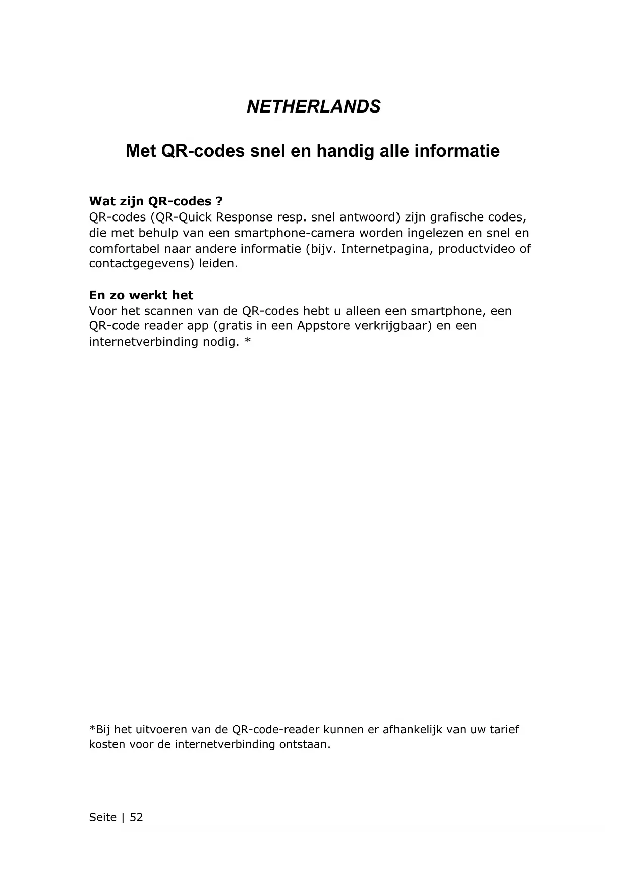 Wat zijn QR-codes ? QR-codes (QR-Quick Response resp. snel antwoord) zijn grafische codes, die met behulp van een smartphone-camera worden ingelezen en snel en comfortabel naar andere informatie (bijv. Internetpagina, productvideo of contactgegevens) leiden. En zo werkt het Voor het scannen van de QR-codes hebt u alleen een smartphone, een QR-code reader app (gratis in een Appstore verkrijgbaar) en een internetverbinding nodig. *