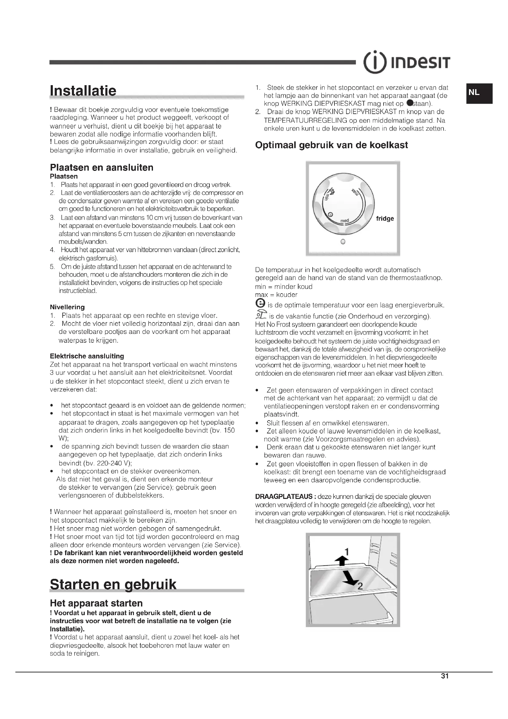 Installatie !Bewaarditboekjezorgvuldigvooreventueletoekomstige raadpleging.Wanneeruhetproductweggeeft,verkooptof wanneeruverhuist,dientuditboekjebijhetapparaatte bewarenzodatallenodigeinformatievoorhandenblijft. ! Leesdegebruiksaanwijzingenzorgvuldigdoor:erstaat belangrijkeinformatieinoverinstallatie,gebruikenveiligheid. Plaatsen en aansluiten Plaatsen