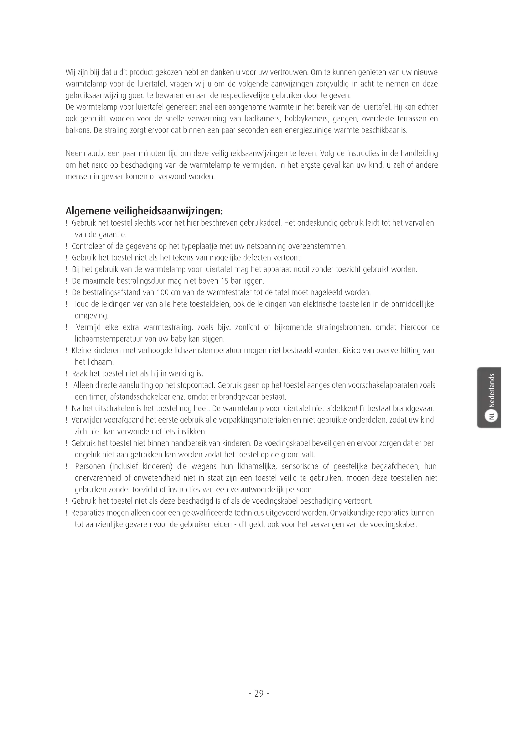 - Les réparations ne doivent être effectuées que par un professionnel. Veuillez conserver la preuve d‘achat, le mode d‘emploi et le numéro d‘article. Si vous pensez devoir formuler une réclamation de garantie, veuillez contacter votre revendeur. Toutes les caractéristiques techniques, les informations et les propriétés du produit correspondent à son état à la date de la publication de cette notice. Les informations du fabricant sont fiables et exactes. Elles sont communiquées de bonne foi. La société ne saurait toutefois être tenue responsable d‘erreurs dans cette notice et se réserve le droit d‘apporter sans préavis des modifications au design et à la spécification du produit. Copie et communication graphique, électronique, mécanique ou de quelque forme que ce soit par photocopie, enregistrement sur bande ou sauvegarde dans une base de données du contenu, même partiel, de cette notice protégée par les droits d‘auteur, n‘est permise qu‘avec l’autorisation écrite préalable de la société REER. Remarque concernant la protection de l‘environnement: A la fin de sa durée de service, cet appareil ne doit pas être éliminé avec les déchets ménagers, mais doit être confié à un point de collecte pour recyclage d‘appareils électriques. Le symbole figurant sur le produit, dans le mode d‘emploi ou sur l‘emballage rappelle cette obligation. Les matériaux de cet appareil portent des marquages, nécessaires au recyclage. Avec la valorisation, le recyclage ou d‘autres méthodes de récupération des matériaux d‘appareils usagés, vous contribuez efficacement à préservation de l‘environnement. Pour connaître l‘adresse du point de collecte le plus proche, adressez-vous à la mairie de votre commune.- 29 - Wij zijn blij dat u dit product gekozen hebt en danken u voor uw vertrouwen. Om te kunnen genieten van uw nieuwe warmtelamp voor de luiertafel, vragen wij u om de volgende aanwijzingen zorgvuldig in acht te nemen en deze gebruiksaanwijzing goed te bewaren en aan de respectievelijke gebruiker door te geven. De warmtelamp voor luiertafel genereert snel een aangename warmte in het bereik van de luiertafel. Hij kan echter ook gebruikt worden voor de snelle verwarming van badkamers, hobbykamers, gangen, overdekte terrassen en balkons. De straling zorgt ervoor dat binnen een paar seconden een energiezuinige warmte beschikbaar is. Neem a.u.b. een paar minuten tijd om deze veiligheidsaanwijzingen te lezen. Volg de instructies in de handleiding om het risico op beschadiging van de warmtelamp te vermijden. In het ergste geval kan uw kind, u zelf of andere mensen in gevaar komen of verwond worden. Algemene veiligheidsaanwijzingen: ! Gebruik het toestel slechts voor het hier beschreven gebruiksdoel. Het ondeskundig gebruik leidt tot het vervallen van de garantie. ! Controleer of de gegevens op het typeplaatje met uw netspanning overeenstemmen. ! Gebruik het toestel niet als het tekens van mogelijke defecten vertoont. ! Bij het gebruik van de warmtelamp voor luiertafel mag het apparaat nooit zonder toezicht gebruikt worden. ! De maximale bestralingsduur mag niet boven 15 bar liggen. ! De bestralingsafstand van 100 cm van de warmtestraler tot de tafel moet nageleefd worden. ! Houd de leidingen ver van alle hete toesteldelen, ook de leidingen van elektrische toestellen in de onmiddellijke omgeving. ! Vermijd elke extra warmtestraling, zoals bijv. zonlicht of bijkomende stralingsbronnen, omdat hierdoor de lichaamstemperatuur van uw baby kan stijgen. ! Kleine kinderen met verhoogde lichaamstemperatuur mogen niet bestraald worden. Risico van oververhitting van het lichaam. ! Raak het toestel niet als hij in werking is. ! Alleen directe aansluiting op het stopcontact. Gebruik geen op het toestel aangesloten voorschakelapparaten zoals een timer, afstandsschakelaar enz. omdat er brandgevaar bestaat. ! Na het uitschakelen is het toestel nog heet. De warmtelamp voor luiertafel niet afdekken! Er bestaat brandgevaar. ! Verwijder voorafgaand het eerste gebruik alle verpakkingsmaterialen en niet gebruikte onderdelen, zodat uw kind zich niet kan verwonden of iets inslikken. ! Gebruik het toestel niet binnen handbereik van kinderen. De voedingskabel beveiligen en ervoor zorgen dat er per ongeluk niet aan getrokken kan worden zodat het toestel op de grond valt. ! Personen (inclusief kinderen) die wegens hun lichamelijke, sensorische of geestelijke begaafdheden, hun onervarenheid of onwetendheid niet in staat zijn een toestel veilig te gebruiken, mogen deze toestellen niet gebruiken zonder toezicht of instructies van een verantwoordelijk persoon. ! Gebruik het toestel niet als deze beschadigd is of als de voedingskabel beschadiging vertoont. ! Reparaties mogen alleen door een gekwalificeerde technicus uitgevoerd worden. Onvakkundige reparaties kunnen tot aanzienlijke gevaren voor de gebruiker leiden - dit geldt ook voor het vervangen van de voedingskabel.