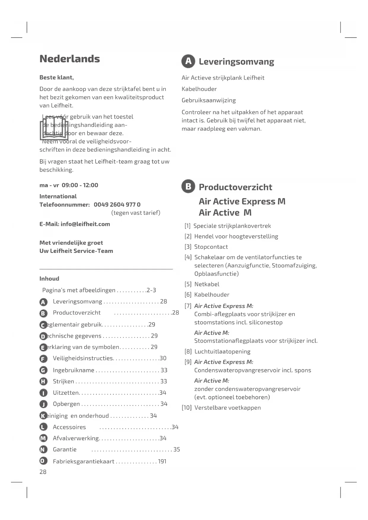 Leveringsomvang Nederlands Beste klant, Door de aankoop van deze strijktafel bent u in het bezit gekomen van een kwaliteitsproduct van Leifheit. Lees vóór gebruik van het toestel de bedieningshandleiding aan- dachtig door en bewaar deze. Neem vooral de veiligheidsvoor- schriften in deze bedieningshandleiding in acht. Bij vragen staat het Leifheit-team graag tot uw beschikking. ma - vr 09:00 - 12:00 International Telefoonnummer: 0049 2604 977 0 (tegen vast tarief) E-Mail: info@leifheit.com Met vriendelijke groet Uw Leifheit Service-Team Air Active Express M Air Active M [1] Speciale strijkplankovertrek [2] Hendel voor hoogteverstelling [3] Stopcontact [4] Schakelaar om de ventilatorfuncties te selecteren (Aanzuigfunctie, Stoomafzuiging, Opblaasfunctie) [5] Netkabel [6] Kabelhouder [7] Air Active Express M: Combi-aegplaatsvoorstrijkijzeren stoomstations incl. siliconestop Air Active M: Stoomstationaegplaatsvoorstrijkijzerincl. [8] Luchtuitlaatopening [9] Air Active Express M: Condenswateropvangreservoir incl. spons Air Active M: zonder condenswateropvangreservoir (evt. optioneel toebehoren) [10] Verstelbare voetkappen Productoverzicht