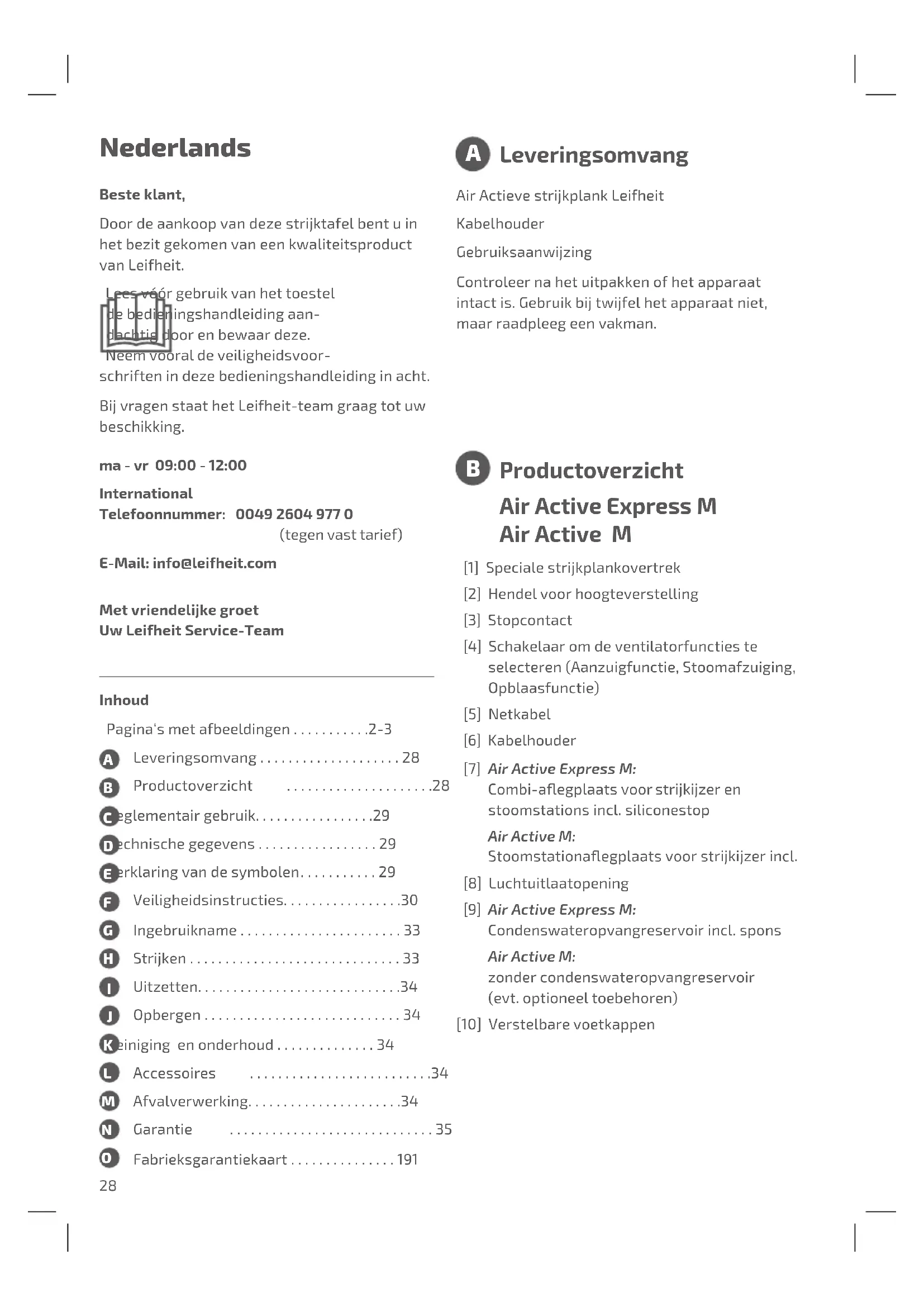 - Fabrieksgarantiekaart Air Actieve strijkplank Leifheit Kabelhouder Gebruiksaanwijzing Controleer na het uitpakken of het apparaat intact is. Gebruik bij twijfel het apparaat niet, maar raadpleeg een vakman. p. 191