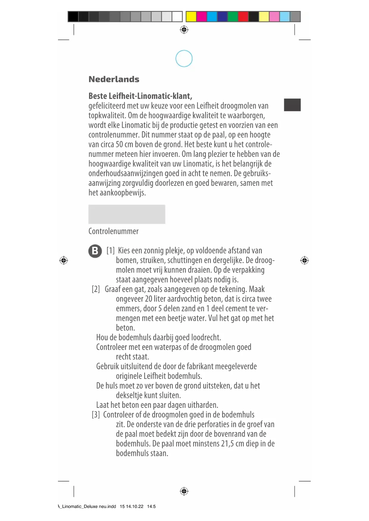 [1] Kies een zonnig plekje, op voldoende afstand van bomen, struiken, schuttingen en dergelijke. De droog- molen moet vrij kunnen draaien. Op de verpakking staat aangegeven hoeveel plaats nodig is. [2] Graaf een gat, zoals aangegeven op de tekening. Maak ongeveer 20 liter aardvochtig beton, dat is circa twee emmers, door 5 delen zand en 1 deel cement te ver- mengen met een beetje water. Vul het gat op met het beton. Hou de bodemhuls daarbij goed loodrecht. Controleer met een waterpas of de droogmolen goed recht staat. Gebruik uitsluitend de door de fabrikant meegeleverde originele Leifheit bodemhuls. De huls moet zo ver boven de grond uitsteken, dat u het dekseltje kunt sluiten. Laat het beton een paar dagen uitharden. [3] Controleer of de droogmolen goed in de bodemhuls zit. De onderste van de drie perforaties in de groef van de paal moet bedekt zijn door de bovenrand van de bodemhuls. De paal moet minstens 21,5 cm diep in de bodemhuls staan. *BA_Linomatic_Deluxe neu.indd 15 14.10.22 14:56C Openen: De droogmolen moet voor elk gebruik op beschadigingen worden gecontroleerd en mag alleen worden gebruikt wanneer van een onberispelijke conditie kan worden uitgegaan. Voor uw eigen veiligheid bij het openen ervoor zorgen dat u stevig staat en dat er zich geen voorwerpen of hindernissen achter uw rug bevinden. [1] Trek nu het opzetkoord schuin naar boven. Even is de startweerstand te voelen, maar dan glijdt de droog- molen gemakkelijk omhoog, tot de waslijnen op de gewenste hoogte en spanning zijn. Het opzetkoord wordt automatisch weer naar binnen getrokken. [2] Bevestig de knop van het opzetkoord aan het glijgewricht, om beschadiging van het koord en erover struikelen te voorkomen.