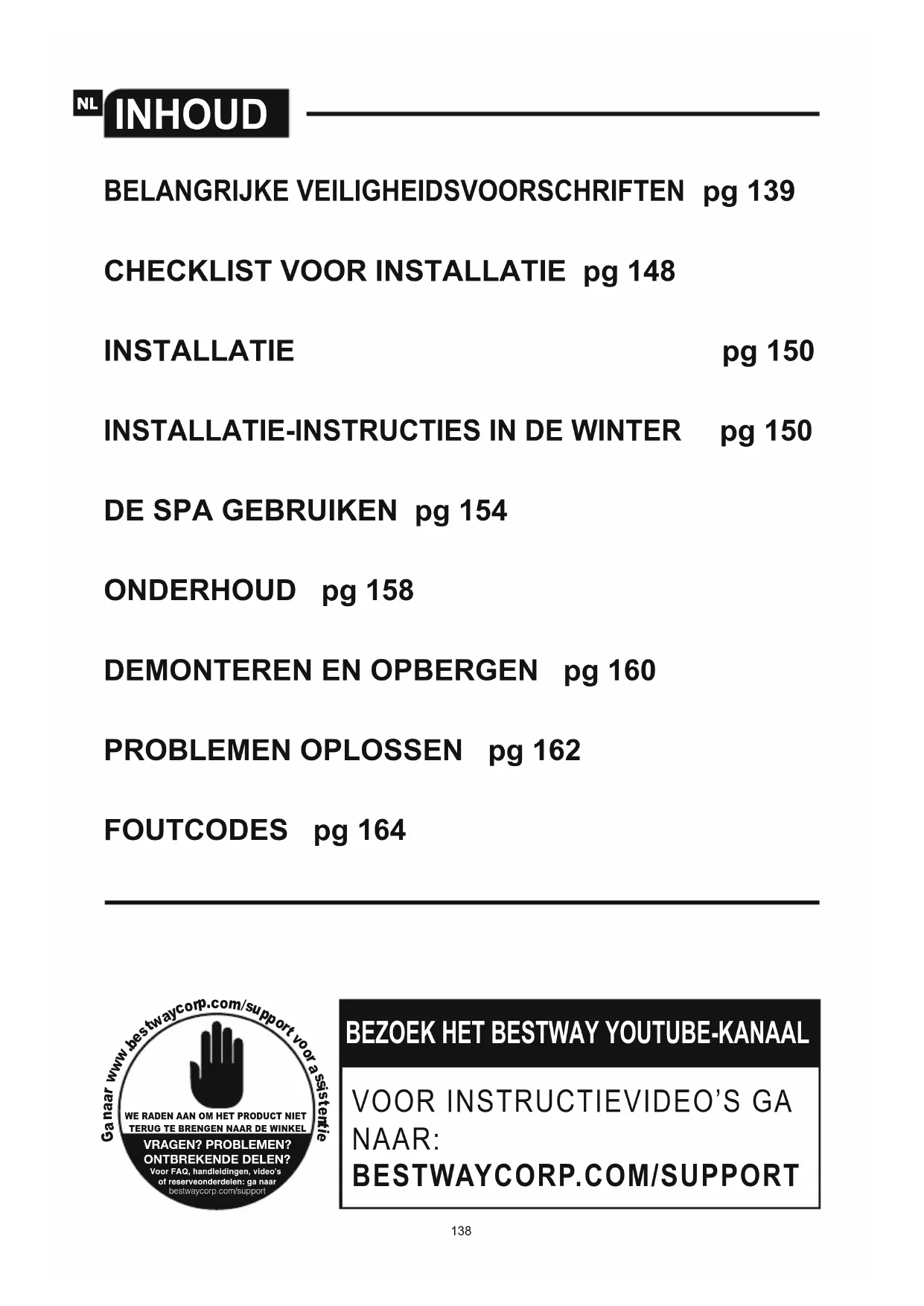 pg 150 DE SPA GEBRUIKEN pg 154 ONDERHOUD pg 158 DEMONTEREN EN OPBERGEN pg 160 PROBLEMEN OPLOSSEN pg 162 FOUTCODES pg 164VEILIGHEIDSVOORSCHRIFTEN Zorg ervoor dat u alle informatie in deze handleiding leest, begrijpt en opvolgt voordat u de spa installeert en gaat gebruiken.