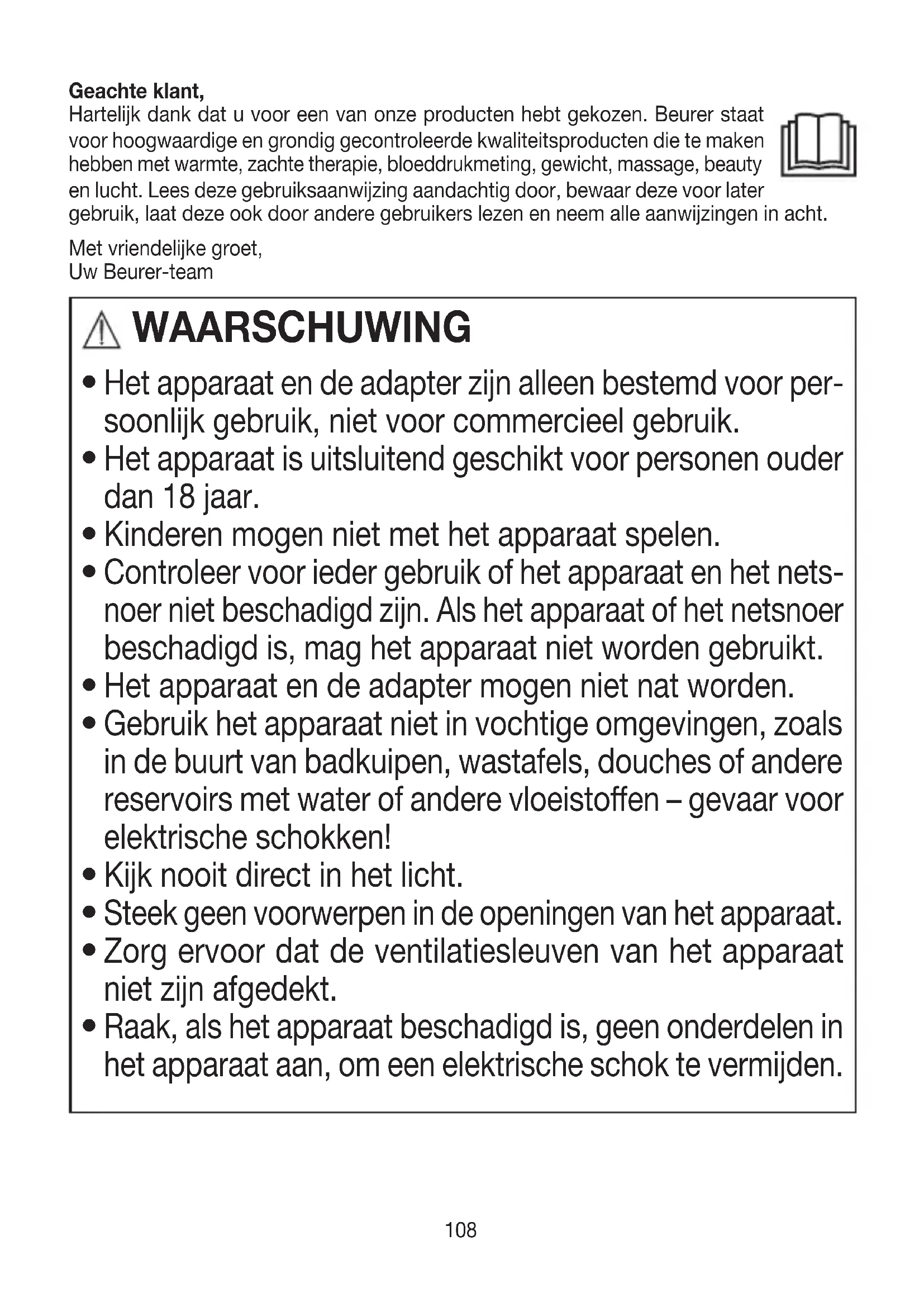 NEDERLANDS108 Geachte klant, Hartelijk dank dat u voor een van onze producten hebt gekozen. Beurer staat voor hoogwaardige en grondig gecontroleerde kwaliteitsproducten die te maken hebben met warmte, zachte therapie, bloeddrukmeting, gewicht, massage, beauty en lucht. Lees deze gebruiksaanwijzing aandachtig door, bewaar deze voor later gebruik, laat deze ook door andere gebruikers lezen en neem alle aanwijzingen in acht. Met vriendelijke groet, Uw Beurer-team WAARSCHUWING