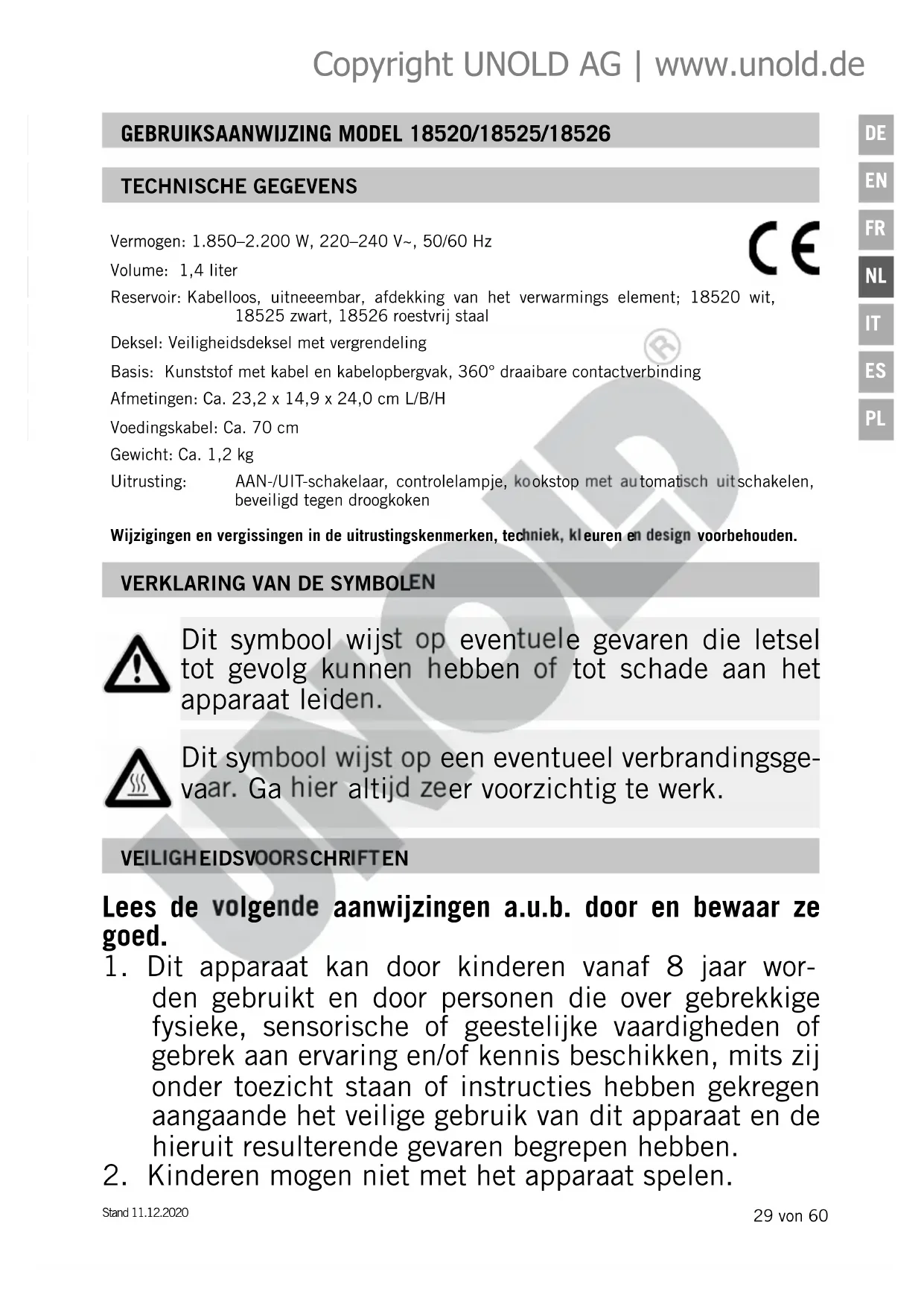 door de fabrikant of zijn klantenservice of een ver- gelijkbaar gekwalificeerde persoon worden vervangen om gevaren te voorkomen. LET OP: Open het deksel niet zolang het water kookt. Als het reservoir overvol gemaakt wordt, kan kokend water eruit spatten. Attentie! Het apparaat is tijdens en na het gebruik zeer heet! Open de behuizing van het apparaat in geen geval. Er bestaat gevaar voor een elektrische schok. Het apparaat mag alleen worden gebruikt met de meegeleverde socket. De fabrikant aanvaardt geen aansprakelijkheid bij foutieve montage, bij ondeskundig of foutief gebruik of als reparaties door niet geautoriseerde personen worden uitgevoerd. Copyright UNOLD AG | www.unold.deStand 11.12.2020 33 von 60