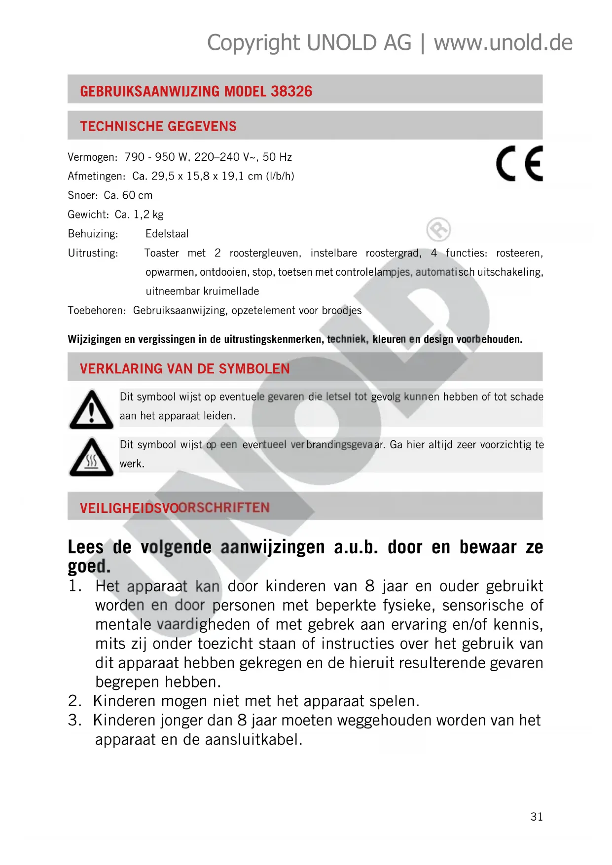 ceerde persoon worden vervangen om gevaren te voorkomen. Copyright UNOLD AG | www.unold.de34 De fabrikant aanvaardt geen aansprakelijkheid bij foutieve montage, bij ondeskundig of foutief gebruik of als reparaties door niet geautoriseerde personen worden uitgevoerd. LET OP: Het apparaat wordt tijdens de werking heel heet! Open de behuizing van het apparaat in geen geval. Geen gereedschappen, bestek of lichaamsdelen in de broodsleuven steken. Er bestaat gevaar voor een elektrische schok.