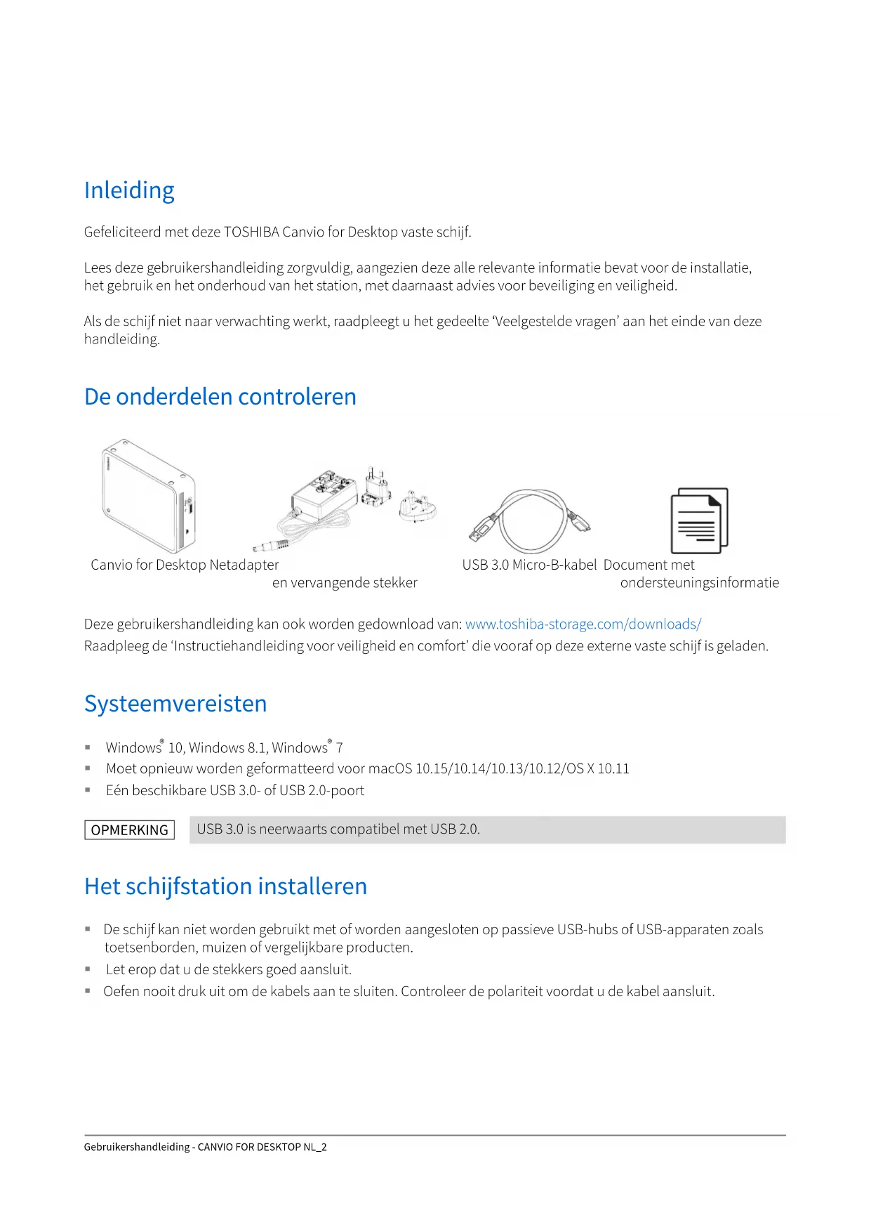 Als ik probeer het station te formatteren, verschijnt het bericht dat de formattering niet kan worden voltooid. A: Dit kan worden veroorzaakt doordat u het station formatteert met het bestandssysteem FAT. Probeer het bestandssysteem NTFS. Hiermee zou u het probleem moeten oplossen. TOSHIBA-ondersteuning Hebt u hulp nodig? Raadpleeg de ondersteuningspagina van TOSHIBA voor vaste schijven en opslagapparaten: www.toshiba-storage.com/support Voor garantieclaims raadpleegt u: www.toshiba-storage.com/warranty-claims Wanneer u het station formatteert, worden alle gegevens op het station verwijderd. OPMERKINGGebruikershandleiding - CANVIO FOR DESKTOP NL_7 Voorschriften Overeenstemming met CE-richtlijnen Werkomgeving De elektromagnetische compatibiliteit (EMC) van dit product is gecontroleerd en is standaard voor deze productcategorie voor zogeheten commerciële, lichtindustriële en woonomgevingen. Andere gebruiksomgevingen zijn niet door Toshiba gecontroleerd en het gebruik van dit product in deze gebruiksomgevingen kan beperkt zijn of niet worden aanbevolen. Mogelijke gevolgen van het gebruik van dit product in een niet gecontroleerde gebruiksomgeving zijn: storing van andere producten of van dit product in de nabije omgeving met als gevolg tijdelijke defecten of verlies/beschadiging van gegevens. Voorbeelden van niet-gecontroleerde bedrijfsomgevingen en bijbehorende adviezen: Industriële omgeving (bijvoorbeeld waar krachtstroom van 380 V (drie fasen) wordt gebruikt): risico van storing van dit product door mogelijke sterke elektromagnetische velden, met name in de buurt van zware machines of elektriciteitsinstallaties. Medische omgeving: de naleving van de richtlijnen voor medische producten is niet gecontroleerd door Toshiba. Daarom mag dit product zonder verdere controle niet worden gebruikt als medisch product. Het gebruik in normale kantooromgevingen, zoals in ziekenhuizen, mag geen probleem zijn als er geen beperkingen zijn voorgeschreven door de verantwoordelijke leiding. In een voertuig: raadpleeg de instructies van het betreffende voertuig voor advies met betrekking tot het gebruik van dit product (of deze productcategorie). Vliegtuigomgeving: volg de aanwijzingen van het vliegtuigpersoneel voor beperkingen in gebruik. Andere omgevingen zonder EMC Gebruik buitenshuis: aangezien dit een normaal thuis-/kantoorapparaat is, is dit product niet bestand tegen vocht en is het niet schokbestendig. Explosieve omgeving: het gebruik van dit product in een dergelijke speciale werkomgeving (Ex) is niet toegestaan. De volgende informatie geldt alleen voor EU-lidstaten: REACH - Verklaring van overeenstemming Toshiba voldoet aan alle REACH-vereisten en verplicht zich klanten informatie te geven over de chemische stoffen in onze producten in overeenstemming met de REACH-verordening. Afvalverwerking van producten De volgende informatie geldt alleen voor Turkije: Voldoet aan AEEE-richtlijn. Dit product is voorzien van het CE-keurmerk, in overeenstemming met de vereisten van de toepasselijke EU-richtlijnen. De verantwoording voor de toewijzing van CE-keurmerken ligt bij Toshiba Electronics Europe GmbH, Hansaallee 181, 40549 Düsseldorf, Duitsland. Het gebruik van het symbool geeft aan dat dit product niet als huishoudelijk afval mag worden behandeld. Door dit product op de juiste manier als afval te verwerken, draagt u eraan bij negatieve gevolgen voor het milieu en de menselijke gezondheid die kunnen voortvloeien uit onjuiste verwerking van dit product te voorkomen. Neem voor meer informatie over recycling van dit product contact op met het gemeentekantoor, de afvalverwerkende instantie of de winkel waar u het product hebt gekocht.Kennisgevingen ©2020 TOSHIBA Electronics Europe GmbH. Alle rechten voorbehouden. TOSHIBA behoudt zich het recht voor om technische wijzigingen aan te brengen. TOSHIBA aanvaardt geen enkele aansprakelijkheid voor schade die direct of indirect voortvloeit uit fouten, weglatingen of afwijkingen tussen het product en de documentatie. De naam Toshiba en de Toshiba-logo’s zijn gedeponeerde handelsmerken van Toshiba. macOS is een handelsmerk van Apple Inc. Andere bedrijfsnamen, productnamen en servicenamen kunnen handelsmerken van hun respectieve bedrijven zijn. Productspecificaties, configuraties, kleuren, onderdelen en service kunnen zonder voorafgaande kennisgeving worden gewijzigd. Eén gigabyte (GB) betekent één miljard bytes en één terabyte (TB) betekent één biljoen bytes. De totale beschikbare capaciteit hangt af van het besturingssysteem, en uw resultaten en opslagcapaciteit kunnen dienovereenkomstig verschillen. Het besturingssysteem van een computer vermeldt de opslagcapaciteit echter met machten van 2, waarbij 1 TB = 2