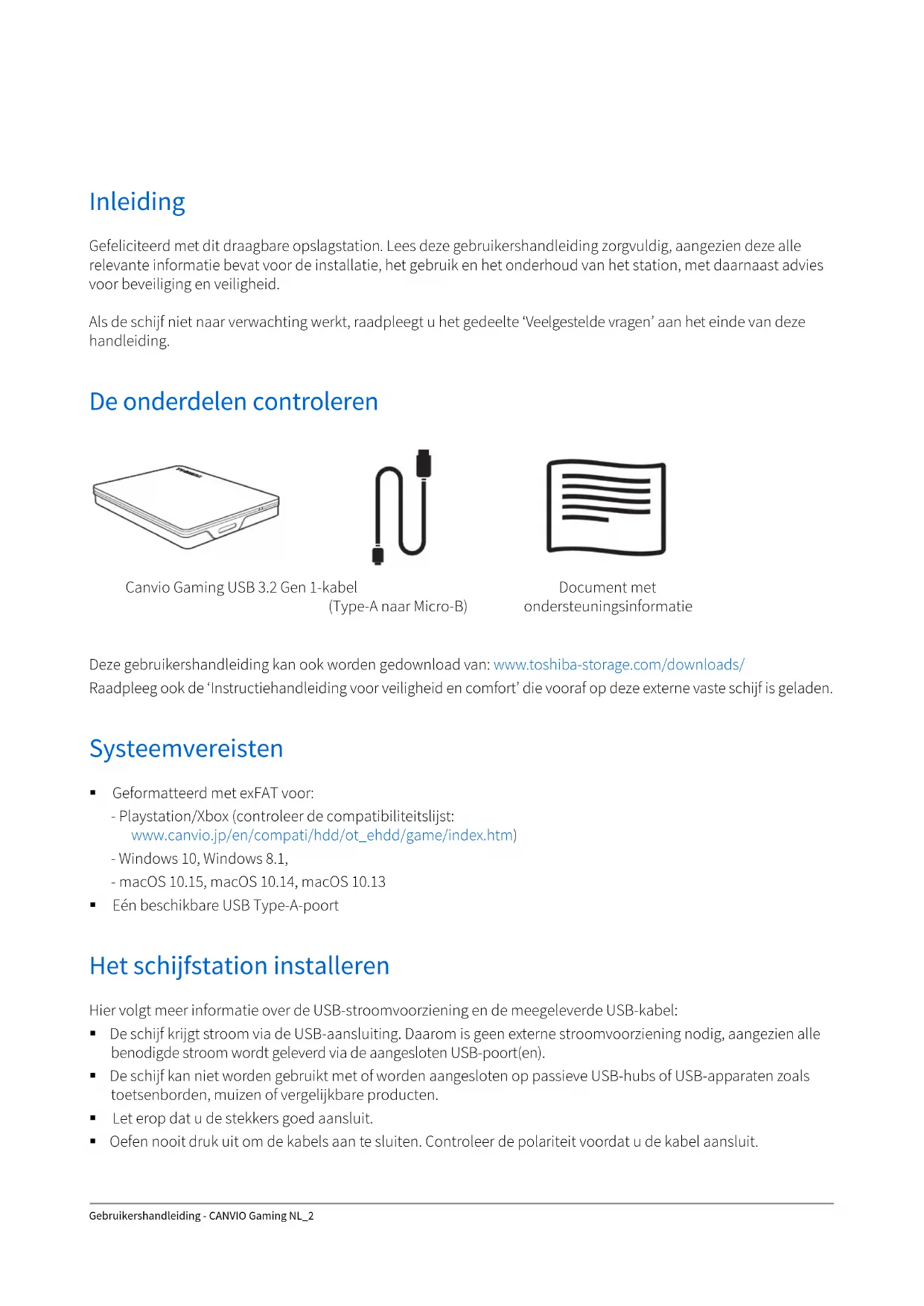 - Voorschriften Gebruikershandleiding - CANVIO Gaming NL_2 Inleiding Gefeliciteerd met dit draagbare opslagstation. Lees deze gebruikershandleiding zorgvuldig, aangezien deze alle relevante informatie bevat voor de installatie, het gebruik en het onderhoud van het station, met daarnaast advies voor beveiliging en veiligheid. Als de schijf niet naar verwachting werkt, raadpleegt u het gedeelte ‘Veelgestelde vragen’ aan het einde van deze handleiding. De onderdelen controleren Deze gebruikershandleiding kan ook worden gedownload van: www.toshiba-storage.com/downloads/ Raadpleeg ook de ‘Instructiehandleiding voor veiligheid en comfort’ die vooraf op deze externe vaste schijf is geladen. Systeemvereisten Geformatteerd met exFAT voor: - Playstation/Xbox (controleer de compatibiliteitslijst: www.canvio.jp/en/compati/hdd/ot_ehdd/game/index.htm) - Windows 10, Windows 8.1, - macOS 10.15, macOS 10.14, macOS 10.13 Eén beschikbare USB Type-A-poort Het schijfstation installeren Hier volgt meer informatie over de USB-stroomvoorziening en de meegeleverde USB-kabel: De schijf krijgt stroom via de USB-aansluiting. Daarom is geen externe stroomvoorziening nodig, aangezien alle benodigde stroom wordt geleverd via de aangesloten USB-poort(en). De schijf kan niet worden gebruikt met of worden aangesloten op passieve USB-hubs of USB-apparaten zoals toetsenborden, muizen of vergelijkbare producten. Let erop dat u de stekkers goed aansluit. Oefen nooit druk uit om de kabels aan te sluiten. Controleer de polariteit voordat u de kabel aansluit. Canvio Gaming USB 3.2 Gen 1-kabel (Type-A naar Micro-B) Document met ondersteuningsinformatieGebruikershandleiding - CANVIO Gaming NL_3 Het station aansluiten op uw compatibele apparaat Controleer de compatibiliteit en aansluitinstructies voor een apparaat in de gebruikershandleiding van het desbetreffende apparaat. p. 6