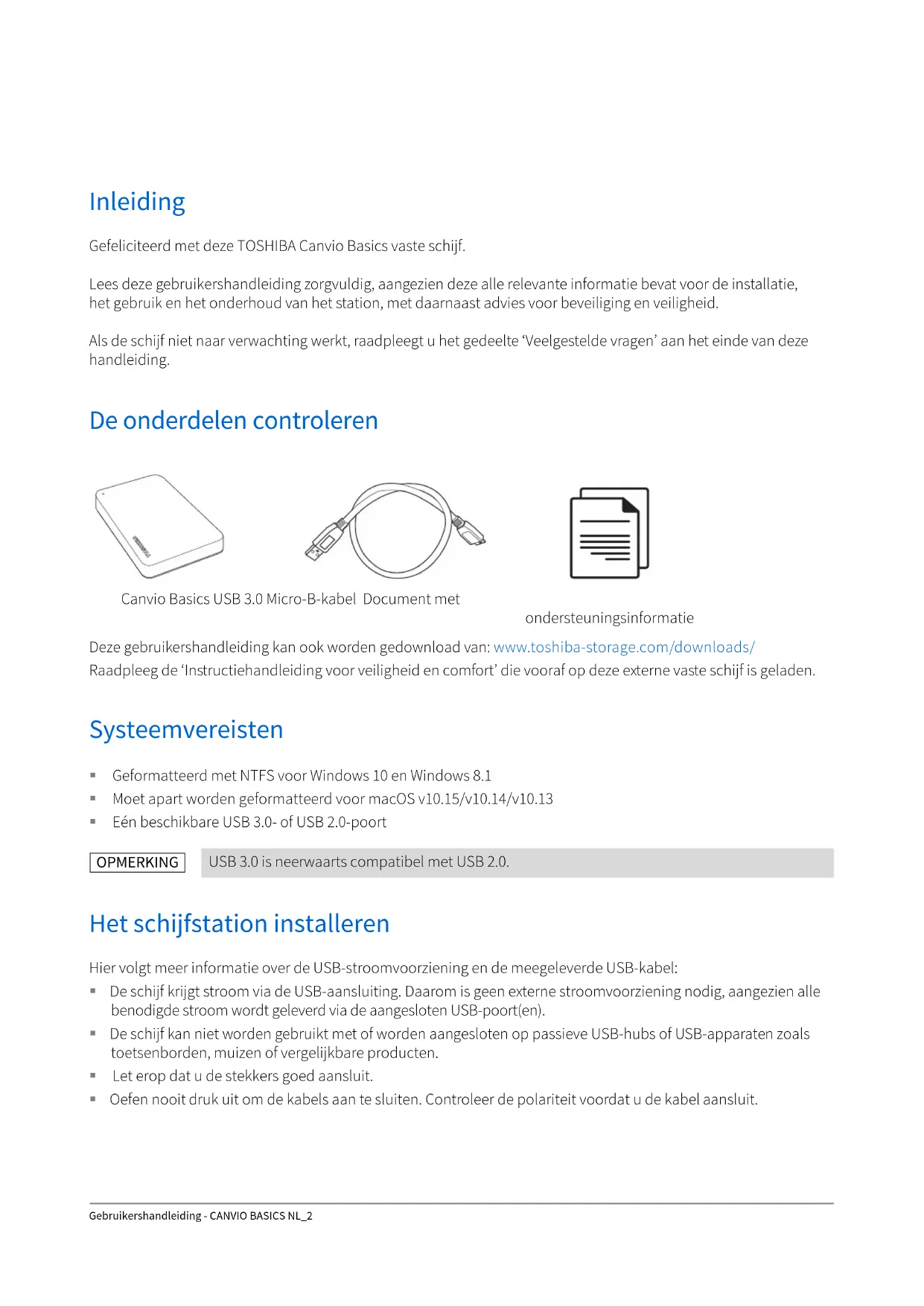 - Voorschriften Gebruikershandleiding - CANVIO BASICS NL_2 Inleiding Gefeliciteerd met deze TOSHIBA Canvio Basics vaste schijf. Lees deze gebruikershandleiding zorgvuldig, aangezien deze alle relevante informatie bevat voor de installatie, het gebruik en het onderhoud van het station, met daarnaast advies voor beveiliging en veiligheid. Als de schijf niet naar verwachting werkt, raadpleegt u het gedeelte ‘Veelgestelde vragen’ aan het einde van deze handleiding. De onderdelen controleren Deze gebruikershandleiding kan ook worden gedownload van: www.toshiba-storage.com/downloads/ Raadpleeg de ‘Instructiehandleiding voor veiligheid en comfort’ die vooraf op deze externe vaste schijf is geladen. Systeemvereisten Geformatteerd met NTFS voor Windows 10 en Windows 8.1 Moet apart worden geformatteerd voor macOS v10.15/v10.14/v10.13 Eén beschikbare USB 3.0- of USB 2.0-poort Het schijfstation installeren Hier volgt meer informatie over de USB-stroomvoorziening en de meegeleverde USB-kabel: De schijf krijgt stroom via de USB-aansluiting. Daarom is geen externe stroomvoorziening nodig, aangezien alle benodigde stroom wordt geleverd via de aangesloten USB-poort(en). De schijf kan niet worden gebruikt met of worden aangesloten op passieve USB-hubs of USB-apparaten zoals toetsenborden, muizen of vergelijkbare producten. Let erop dat u de stekkers goed aansluit. Oefen nooit druk uit om de kabels aan te sluiten. Controleer de polariteit voordat u de kabel aansluit. USB 3.0 is neerwaarts compatibel met USB 2.0. Canvio Basics USB 3.0 Micro-B-kabel Document met ondersteuningsinformatie OPMERKINGGebruikershandleiding - CANVIO BASICS NL_3 Het schijfstation op de computer aansluiten p. 6