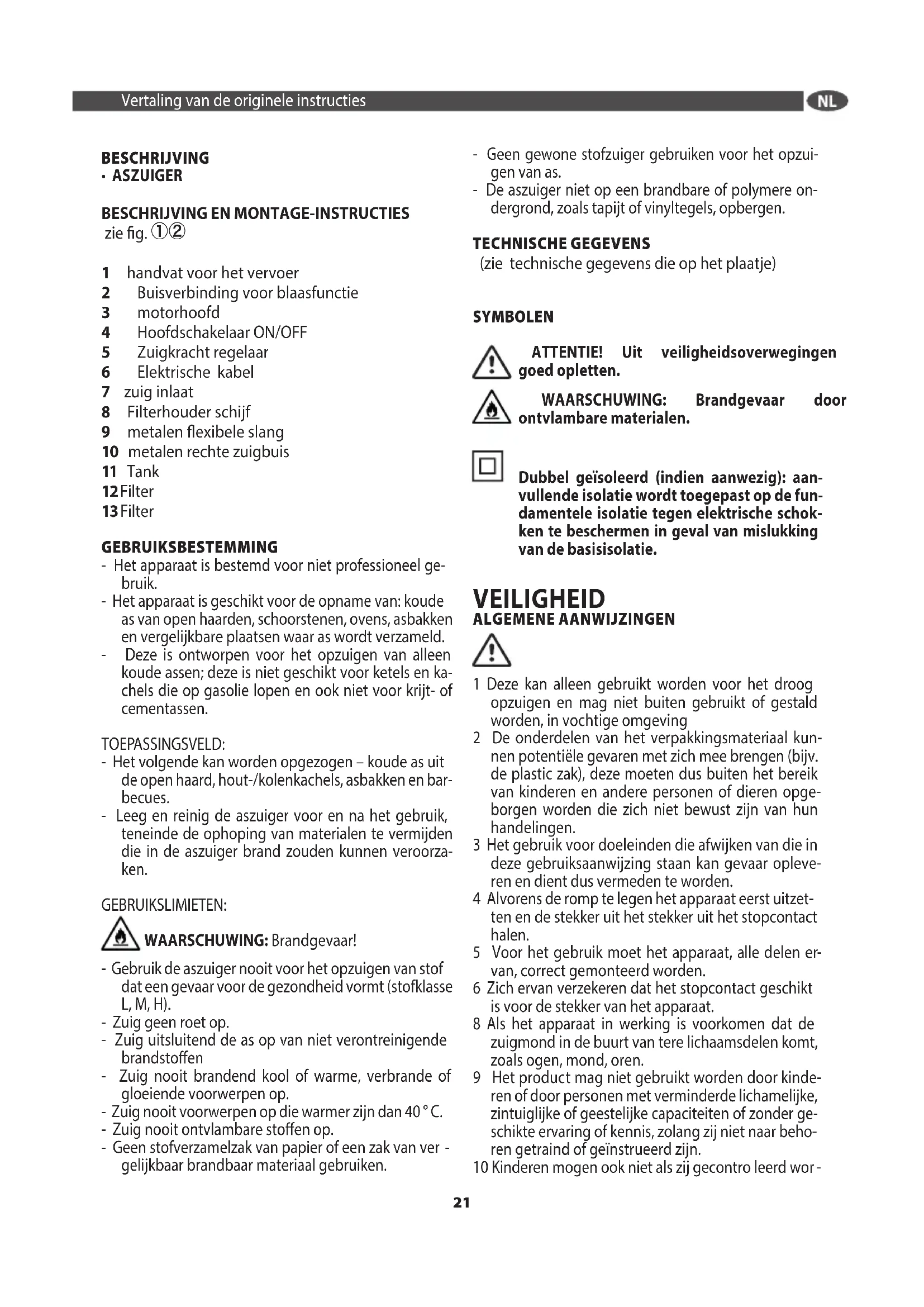 1 handvat voor het vervoer 2 Buisverbinding voor blaasfunctie 3 motorhoofd 4 Hoofdschakelaar ON/OFF 5 Zuigkracht regelaar 6 Elektrische kabel 7 zuig inlaat 8 Filterhouder schijf 9 metalen exibele slang 10 metalen rechte zuigbuis 11 Tank 12 Filter 13 Filter GEBRUIKSBESTEMMING - Het apparaat is bestemd voor niet professioneel ge- bruik. - Het apparaat is geschikt voor de opname van: koude as van open haarden, schoorstenen, ovens, asbakken en vergelijkbare plaatsen waar as wordt verzameld. - Deze is ontworpen voor het opzuigen van alleen koude assen; deze is niet geschikt voor ketels en ka- chels die op gasolie lopen en ook niet voor krijt- of cementassen. TOEPASSINGSVELD: - Het volgende kan worden opgezogen – koude as uit de open haard, hout-/kolenkachels, asbakken en bar- becues. - Leeg en reinig de aszuiger voor en na het gebruik, teneinde de ophoping van materialen te vermijden die in de aszuiger brand zouden kunnen veroorza- ken. GEBRUIKSLIMIETEN: WAARSCHUWING: Brandgevaar! - Gebruik de aszuiger nooit voor het opzuigen van stof dat een gevaar voor de gezondheid vormt (stofklasse L, M, H). - Zuig geen roet op. - Zuig uitsluitend de as op van niet verontreinigende brandstoen - Zuig nooit brandend kool of warme, verbrande of gloeiende voorwerpen op. - Zuig nooit voorwerpen op die warmer zijn dan 40 ° C. - Zuig nooit ontvlambare stoen op. - Geen stofverzamelzak van papier of een zak van ver
