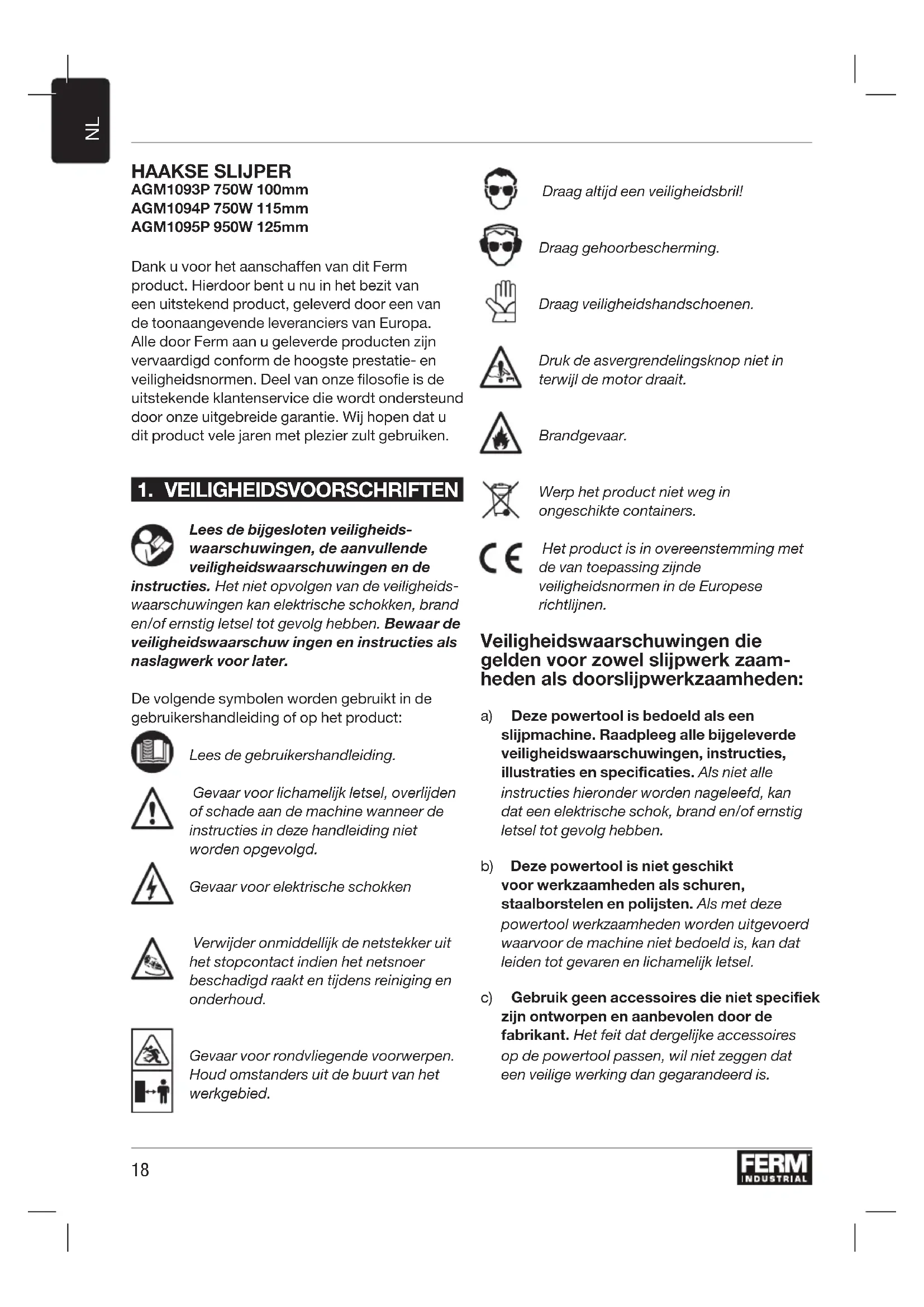 HAAKSE SLIJPER AGM1093P 750W 100mm AGM1094P 750W 115mm AGM1095P 950W 125mm Dank u voor het aanschaffen van dit Ferm product. Hierdoor bent u nu in het bezit van een uitstekend product, geleverd door een van de toonaangevende leveranciers van Europa. Alle door Ferm aan u geleverde producten zijn vervaardigd conform de hoogste prestatie- en veiligheidsnormen. Deel van onze filosofie is de uitstekende klantenservice die wordt ondersteund door onze uitgebreide garantie. Wij hopen dat u dit product vele jaren met plezier zult gebruiken.