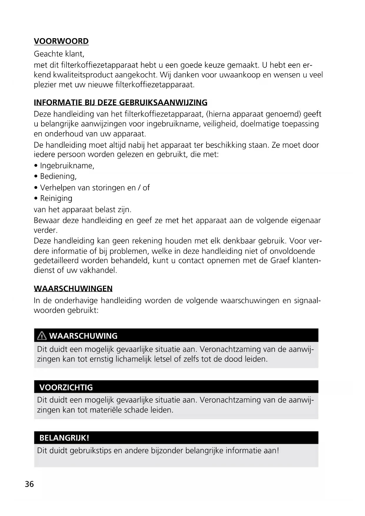 - Reiniging van het apparaat belast zn. Bewaar deze handleiding en geef ze met het apparaat aan de volgende eigenaar verder. Deze handleiding kan geen rekening houden met elk denkbaar gebruik. Voor ver- dere informatie of b problemen, welke in deze handleiding niet of onvoldoende gedetailleerd worden behandeld, kunt u contact opnemen met de Graef klanten- dienst of uw vakhandel. WAARSCHUWINGEN In de onderhavige handleiding worden de volgende waarschuwingen en signaal- woorden gebruikt: WAARSCHUWING Dit duidt een mogelk gevaarlke situatie aan. Veronachtzaming van de aanw- zingen kan tot ernstig lichamelk letsel of zelfs tot de dood leiden. VOORZICHTIG Dit duidt een mogelk gevaarlke situatie aan. Veronachtzaming van de aanw- zingen kan tot materiële schade leiden. BELANGRK! Dit duidt gebruikstips en andere bzonder belangrke informatie aan!37