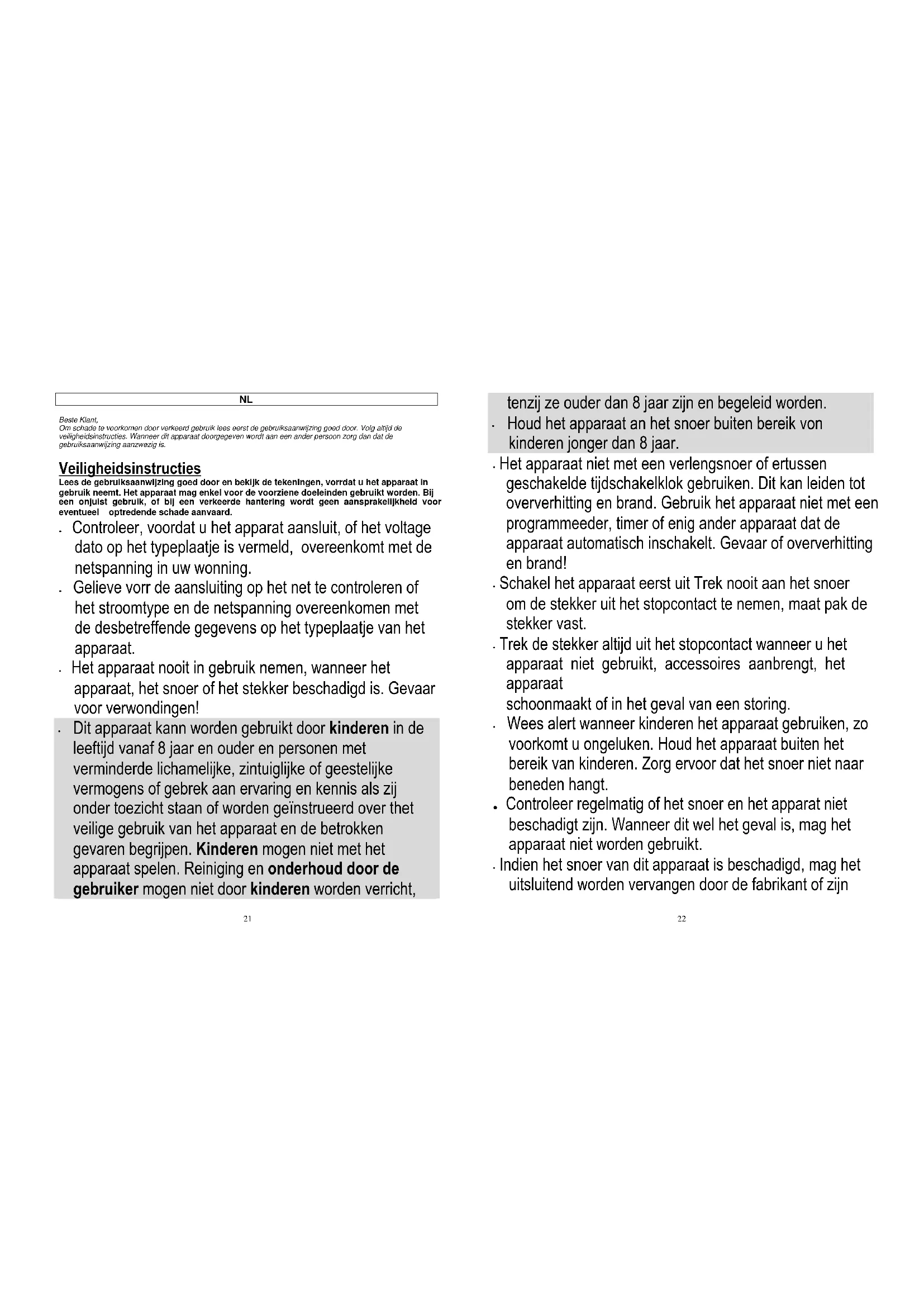 Houd het apparaat an het snoer buiten bereik von kinderen jonger dan 8 jaar.