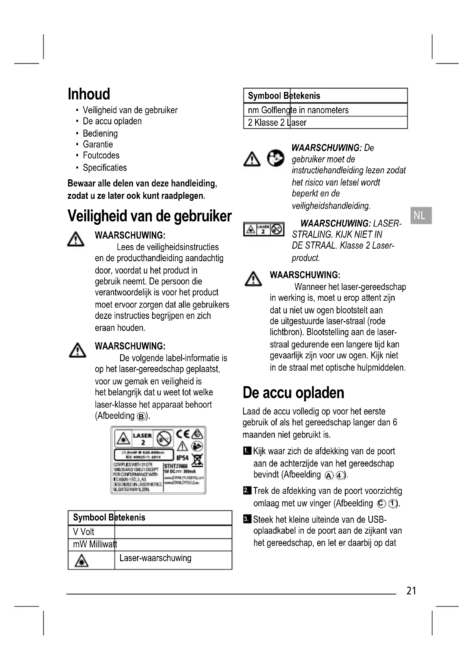 Symbool Betekenis V Volt mW Milliwatt Laser-waarschuwing Symbool Betekenis nm Golengte in nanometers 2 Klasse 2 Laser WAARSCHUWING: De gebruiker moet de instructiehandleiding lezen zodat het risico van letsel wordt beperkt en de veiligheidshandleiding. WAARSCHUWING: LASER-