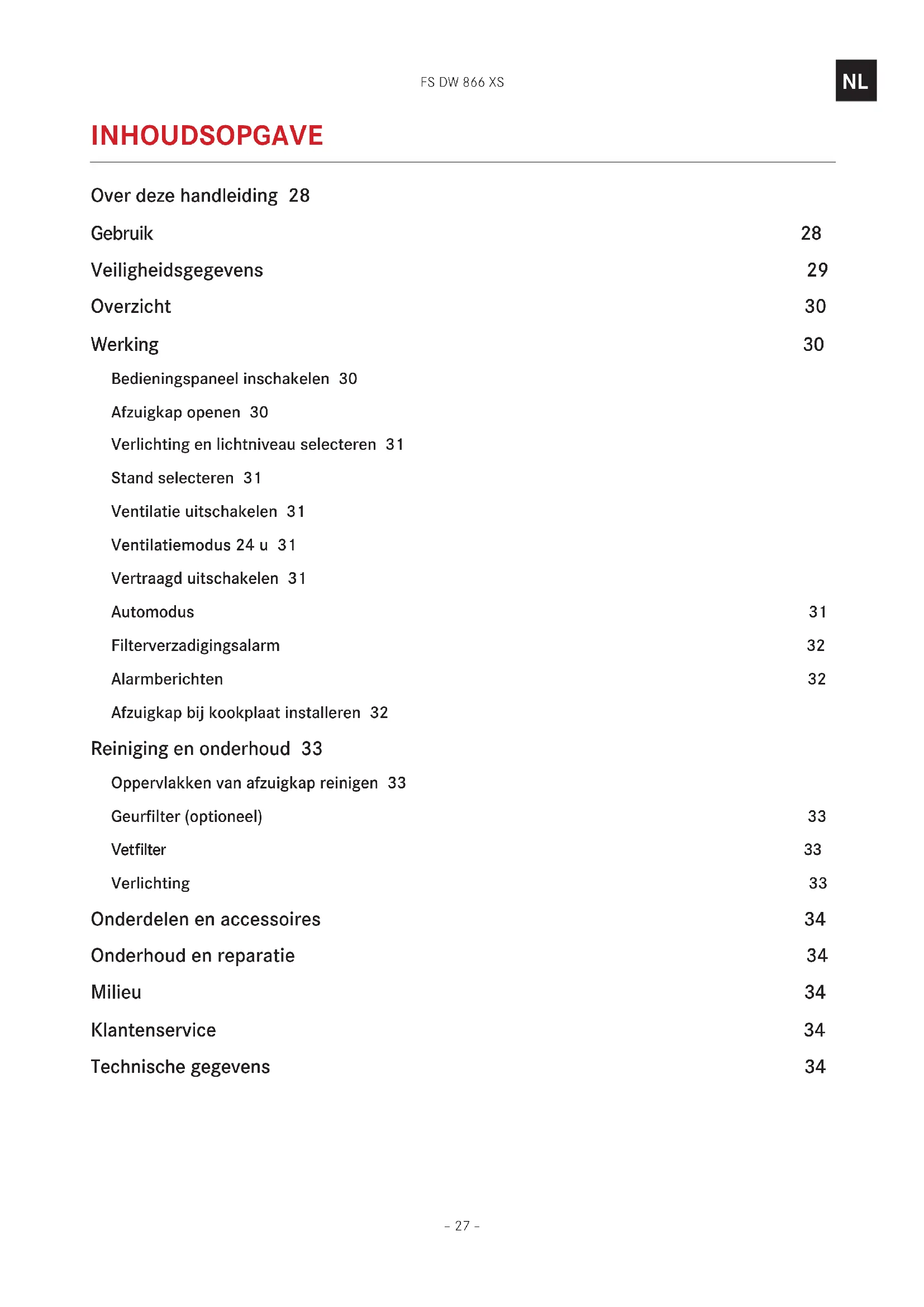 INHOUDSOPGAVE Over deze handleiding 28 Gebruik 28 Veiligheidsgegevens 29 Overzicht 30 Werking 30 Bedieningspaneel inschakelen 30 Afzuigkap openen 30 Verlichting en lichtniveau selecteren 31 Stand selecteren 31 Ventilatie uitschakelen 31 Ventilatiemodus 24 u 31 Vertraagd uitschakelen 31 Automodus 31 Filterverzadigingsalarm 32 Alarmberichten 32 Afzuigkap bij kookplaat installeren 32 Reiniging en onderhoud 33 Oppervlakken van afzuigkap reinigen 33 Geurfilter (optioneel) 33 Vetfilter 33 Verlichting 33 Onderdelen en accessoires 34 Onderhoud en reparatie 34 Milieu 34 Klantenservice 34 Technische gegevens 34FS DW 866 XS – 28 –